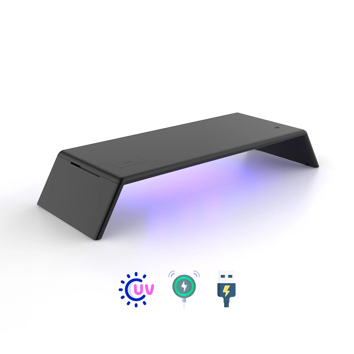 Uwolnij się od napięcia, bólów głowy lub zmęczenia oczu i szyi. Przekształć swoje tradycyjne biurko w ergonomiczne stanowisko pracy. Ta designerska stacja robocza podnosi monitor do komfortowego poziomu widzenia, eliminując niepotrzebne zmęczenie szyi i oczu. Zyskaj większy komfort pracy przy biurku i utrzymaj porządek - przechowuj niezbędne przybory biurowe w bocznych pojemnikach (do kupienia osobno). Zdezynfekuj swoje przedmioty dzięki wbudowanej lampie UV. Zainstalowany port ładowania USB pozwoli uzupełnić baterię w urządzeniu mobilnym mając je zawsze pod ręką. Naładuj swojego smartfona bezprzewodowo korzystając z ładowarki indukcyjnej 15 W. Składana konstrukcja umożliwia łatwe przechowywanie i transport. Produkt nie wymaga montażu - kup i używaj. W zestawie z adapterem zasilającym.Lampa UV do walki z wirusami i bakteriami