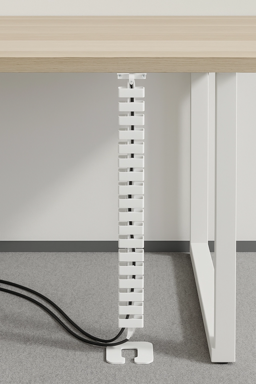 Prowadnica kablowa do biurka: Umożliwia schludne poprowadzenie kabli pod biurkiem lub wzdłuż stelaża.