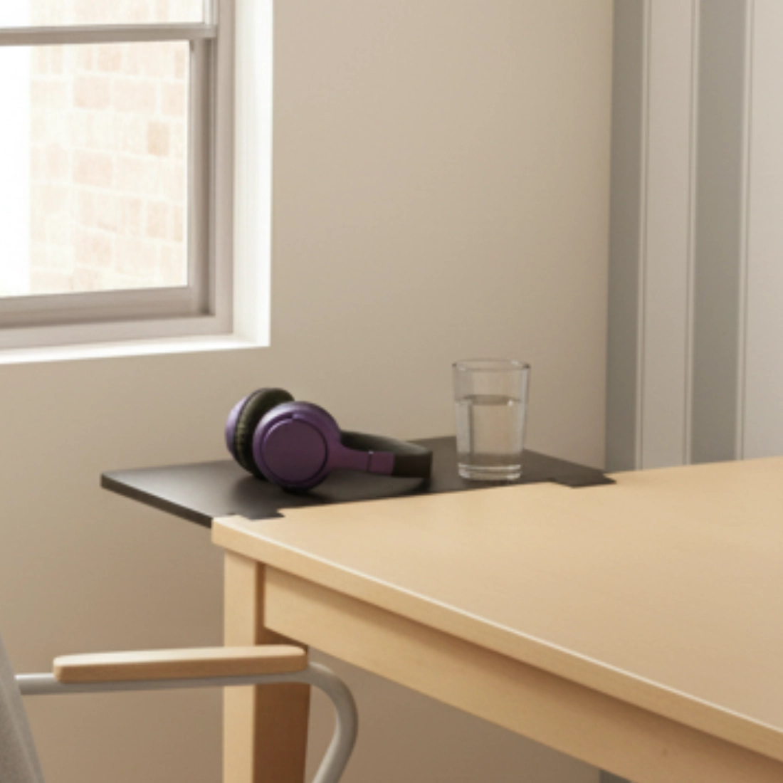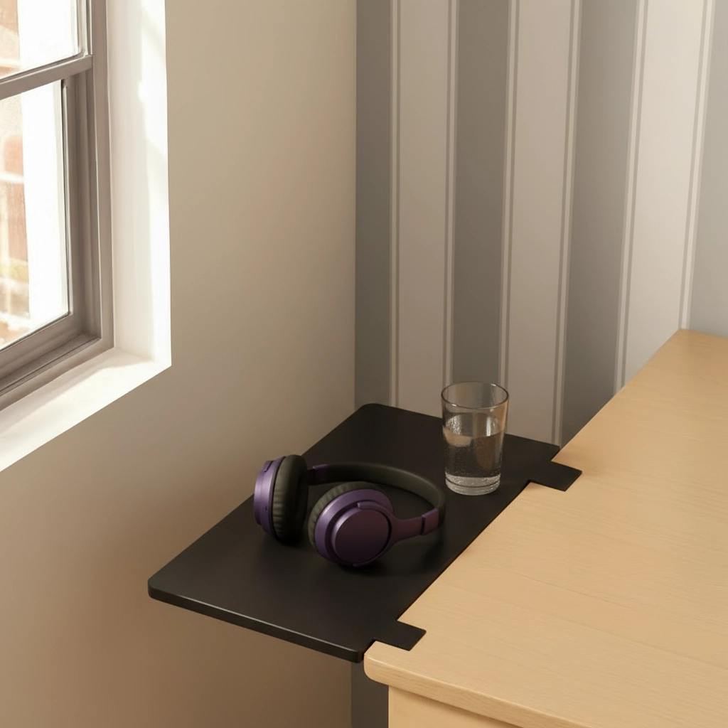 Beznarzędziowy system dwóch stalowych zacisków z pokrętłami pozwala zamontować dostawkę w mniej niż minutę. Przyłóż do krawędzi blatu, dopasuj zaciski, dokręć — i gotowe. Zakres wysunięcia przedłużki względem krawędzi biurka wynosi około 0–11 cm, a po złożeniu blat odstaje od krawędzi biurka o około 4 cm (około 9 cm licząc od końca stopki montażowej).