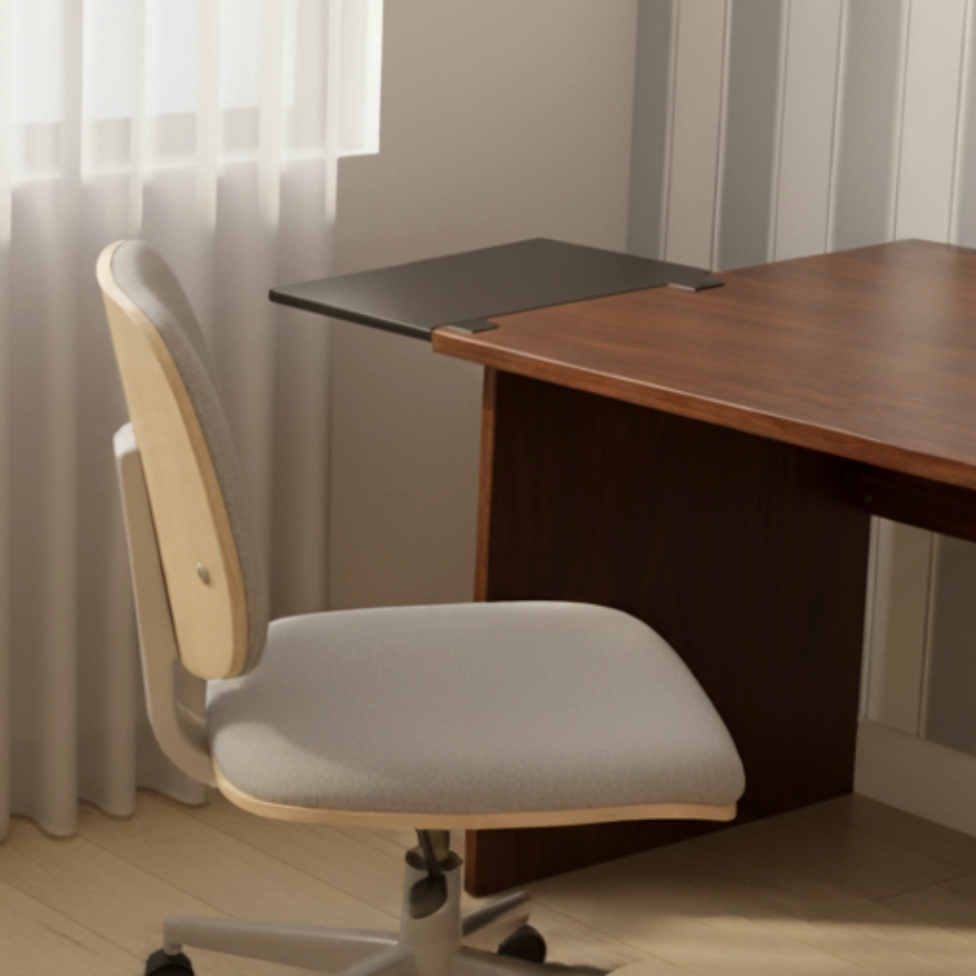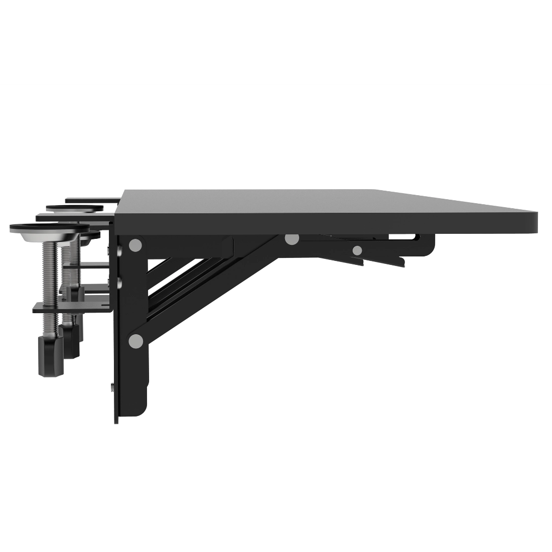 Solidne zaciski gwarantują pewne przyleganie do blatu, a sztywna płyta wiórowa tworzy równą powierzchnię. Maksymalne obciążenie: 15 kg — wystarczająco dla pełnowymiarowej klawiatury, myszy, a nawet cięższych akcesoriów.