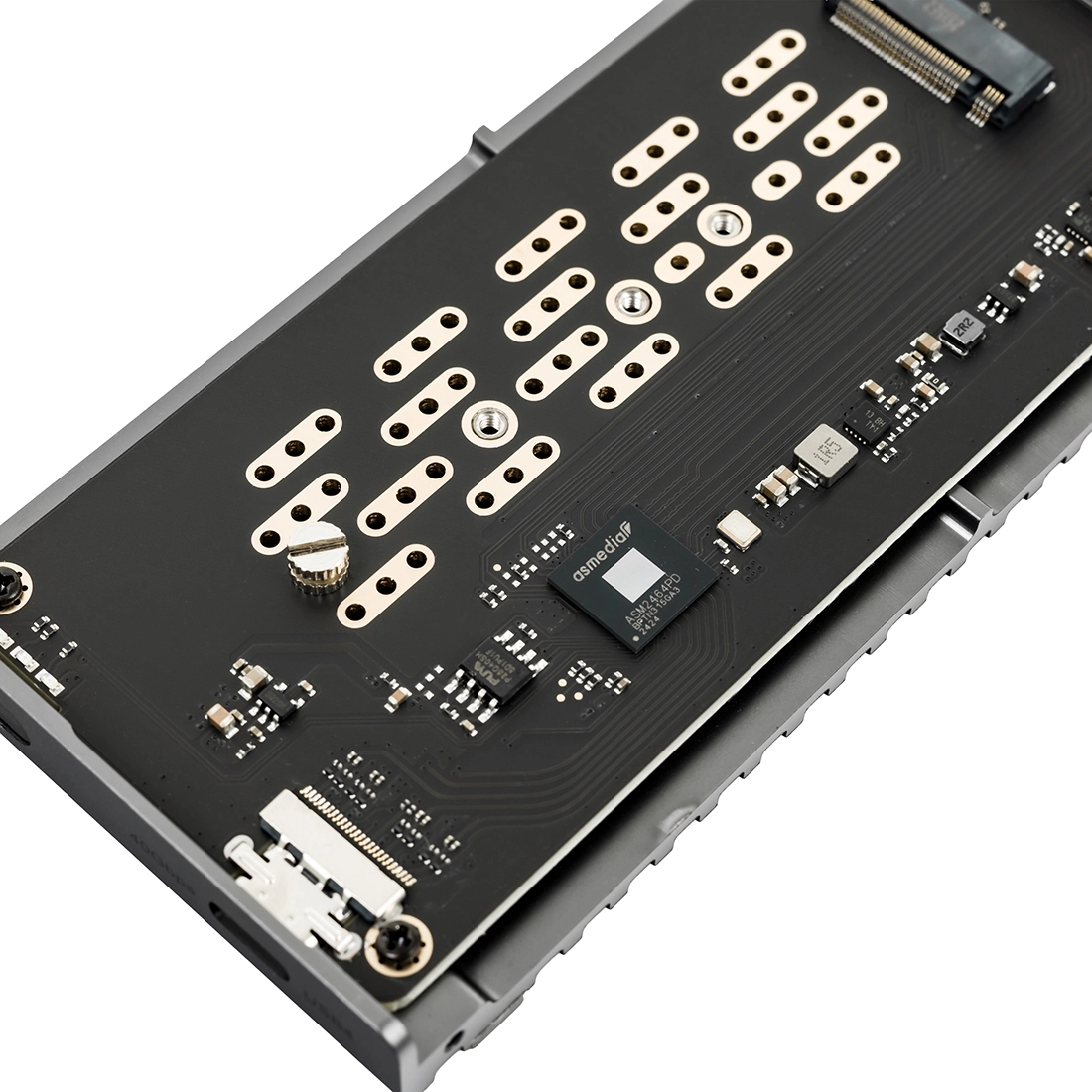 Obudowa działa w standardzie USB4, co oznacza przepustowość do 40 Gb/s i realne transfery rzędu 2,7–3,2 GB/s. To poziom porównywalny z wewnętrznymi dyskami SSD w laptopach. Kopiujesz pliki 4K w kilka sekund, pracujesz bezpośrednio z biblioteką zdjęć czy montujesz wideo bez lagów. Nawet duże projekty wideo lub CAD nie wymagają już przenoszenia na wewnętrzny dysk.