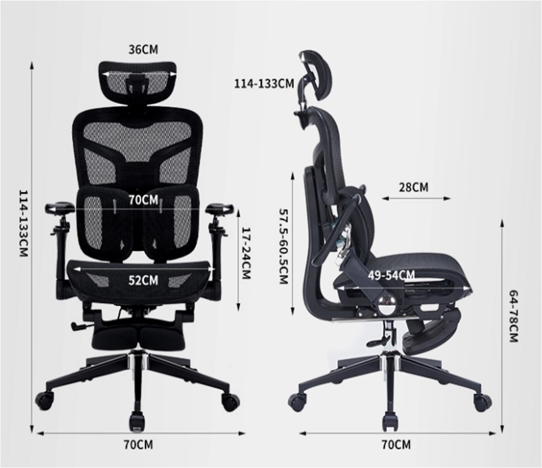 Zakres regulacji — 114–133 cm (19 cm), szeroki zakres regulacji wysokości umożliwia precyzyjne dopasowanie krzesła do wzrostu użytkownika oraz wysokości biurka, zapewniając ergonomiczną i zdrową pozycję siedzenia.