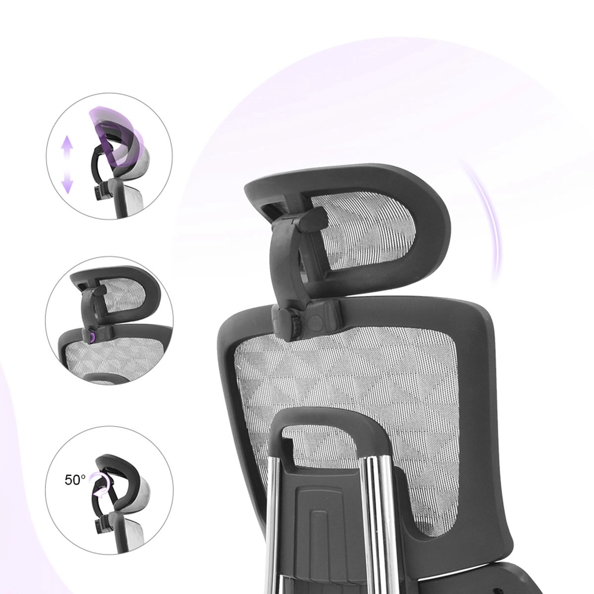 Odpowiednio ustawiony zagłówek na prawidłowej wysokości względem Twojej głowy i szyi. Jest to czynnik, który może zrujnować cały komfort, z doświadczenia jakie będziesz odczuwał podczas siedzenia na krześle - gdy ustawiony źle. Dlatego też fotel biurowy Spacetronik SPC-MIRA daje Ci możliwość dokładnego dopasowania zagłówka do Twojej głowy i szyi. Dzięki mechanizmowi automatycznej blokady masz możliwość ustawienia precyzyjnie jego pozycji. Możesz go swobodnie podnosić, opuszczać, jak i ustawić jego kąt w zakresie do 50°. Wszystko po to, żebyś mógł czerpać jak największą przyjemność ze wszystkich chwil, gdy będziesz na nim siedział.