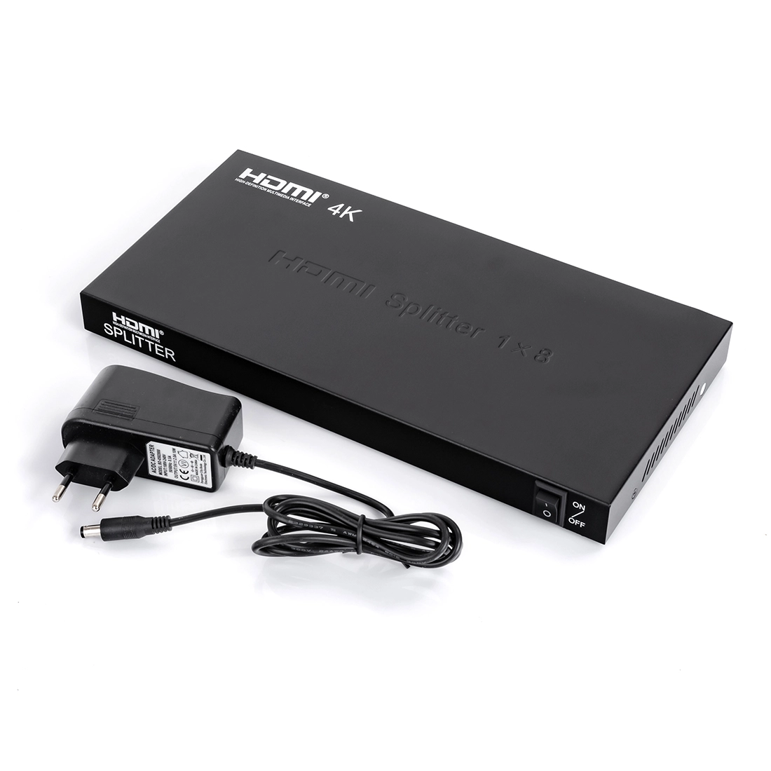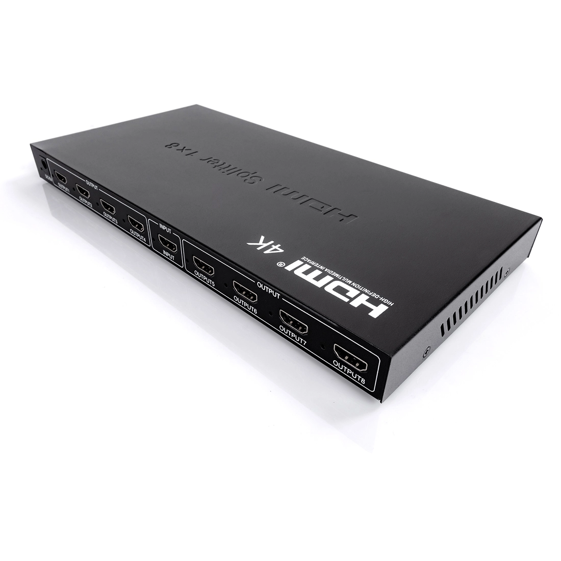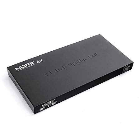 Splitter HDMI 1x8  umożliwia rozprowadzenie sygnału HDMI z jednego źródła na 8 odbiorników (Telewizory, Monitory itp.). Urządzenie przesyła obraz w bardzo wysokiej jakości Ultra HD 4K i pełne 3D. Produkt ten posiada zdolność buforowania sygnału jak i jego wzmacniania. Doskonale nadaje się do sal konferencyjnych aby rozdzielić sygnał z jednego źródła na 8 ekranów czy monitorów. Urządzanie doskonale nadaje się do podłączenia urządzenia HD (tunera satelitarnego, odtwarzacza DVD, komputera, konsoli), do odbiorników telewizyjnych wyposażonych w złącza HDMI.