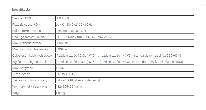 - Wejście obsługa do 10 metrów AWG26 o długości standardowego kabla HDMI, wyjście do 15 metrów długości AWG26 kabla (przy wybranej rozdzielczości 4k, wejście do 5 metrów, wyjście aż do 10 metrów.