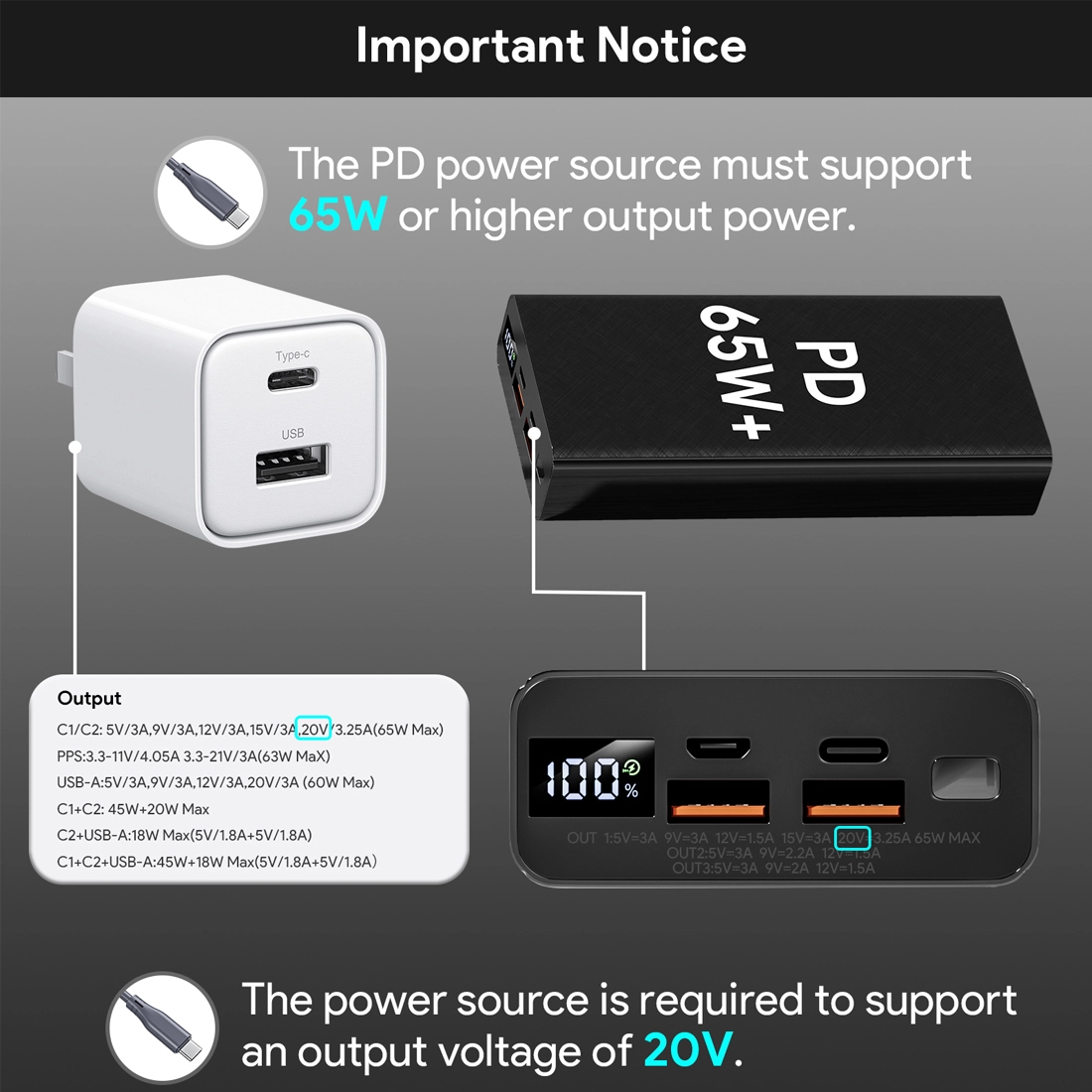 - Wejście 20V 5A PD, zalecana ładowarka 100W