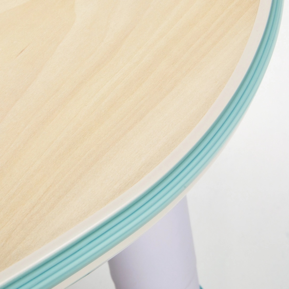 - Jasne drewno blat, białe nóżki, niebieskie wykończenie.