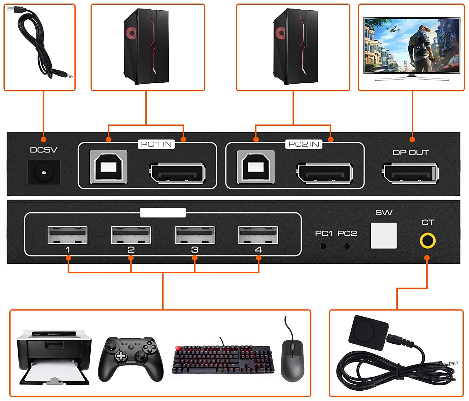 Przełącznik obsługuje rozdzielczości do 8K 60Hz i jest wstecznie kompatybilny z 4K 120Hz, 1080p @120Hz, 720p, 480p; obsługuje HDCP 2.3. Płynna i stabilna transmisja sygnałów i danych zapewnia wykwintny i realistyczny obraz. Automatycznie odczytuje i zapisuje parametry monitora (EDID), gdy jest on podłączony bezpośrednio przez DisplayPort.