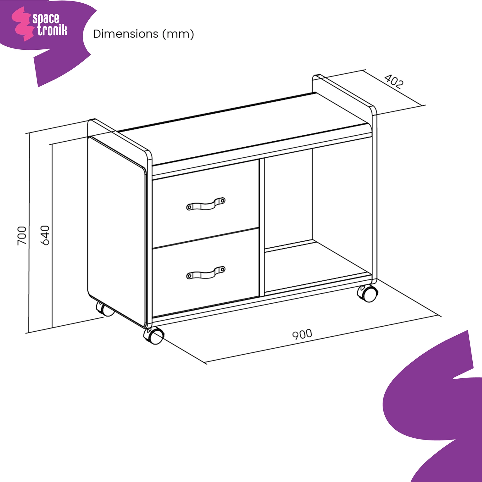 Szafka Spacetronik Frodi, dzięki swojej pojemnej półce i dwóm szufladom znajdzie zastosowanie w wielu różnorakich przestrzeniach. Niezależnie od tego, czy będzie to Twoja sypialnia, biuro czy też magazyn. Ruchome kółka i blat o wymiarach 90×40,2 cm sprawią, że będziesz w stanie wykorzystać szafkę również jako przenośne biurko. Jest wystarczająco duża, by móc bez problemu położyć na niej, chociażby laptopa. Gdy natomiast będziesz czuł potrzebę, będziesz mógł z łatwością razem całą szafką przetransportować się w inne miejsce. Dzięki temu jest to idealne rozwiązanie, chociażby na magazyn lub do dynamicznego nowoczesnego biura.