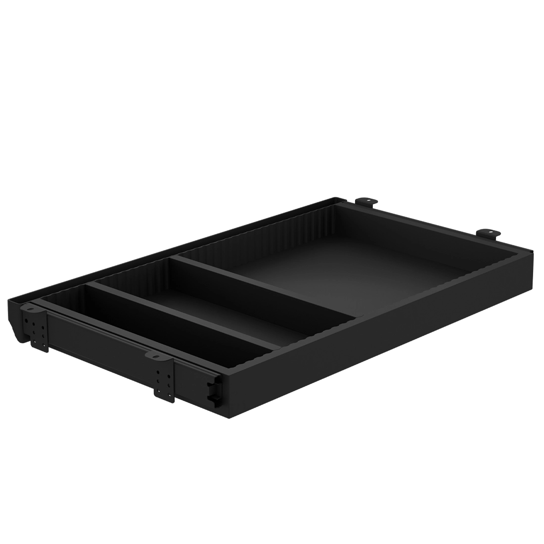 Samodzielna szuflada montowana pod blatem biurka. Dzięki wbudowanym prowadnicom działa jak klasyczna szuflada - wysuwa się płynnie, zapewniając szybki dostęp do przechowywanych rzeczy. Trzy przegrody pomagają utrzymać porządek, a kompaktowa konstrukcja nie zajmuje miejsca na blacie. Montaż bezpośrednio pod biurkiem, bez dodatkowej obudowy.