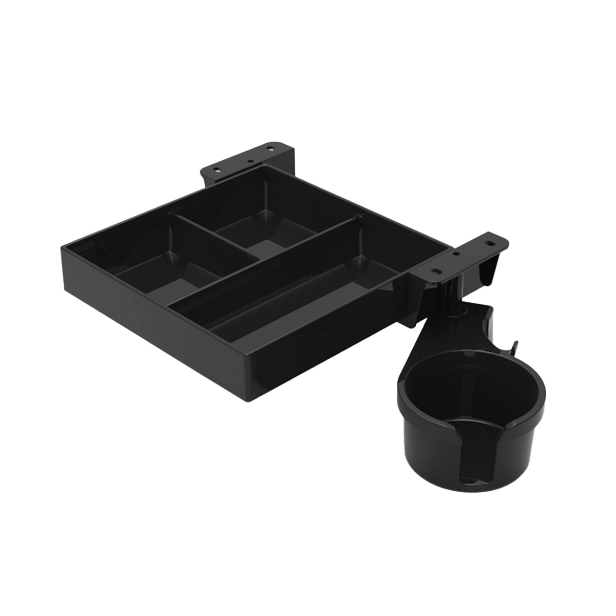Mała, praktyczna szuflada montowana pod blatem z trzema przegródkami na drobiazgi i dedykowanym uchwytem na kubek lub butelkę. Idealna do uporządkowania przestrzeni w biurze, na recepcji albo w domowym miejscu pracy. Montaż za pomocą śrubek.