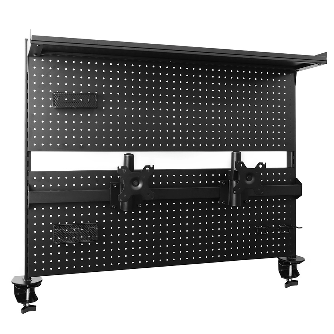 Dwustronna ścianka perforowana z uchwytami na monitory, półką i możliwością pełnej personalizacji. Montowana bezpośrednio do blatu biurka, pozwala uporządkować przestrzeń, zamocować akcesoria i wydzielić wygodne stanowisko pracy. Idealna do biur open space, domowego home office lub przestrzeni technicznych.
