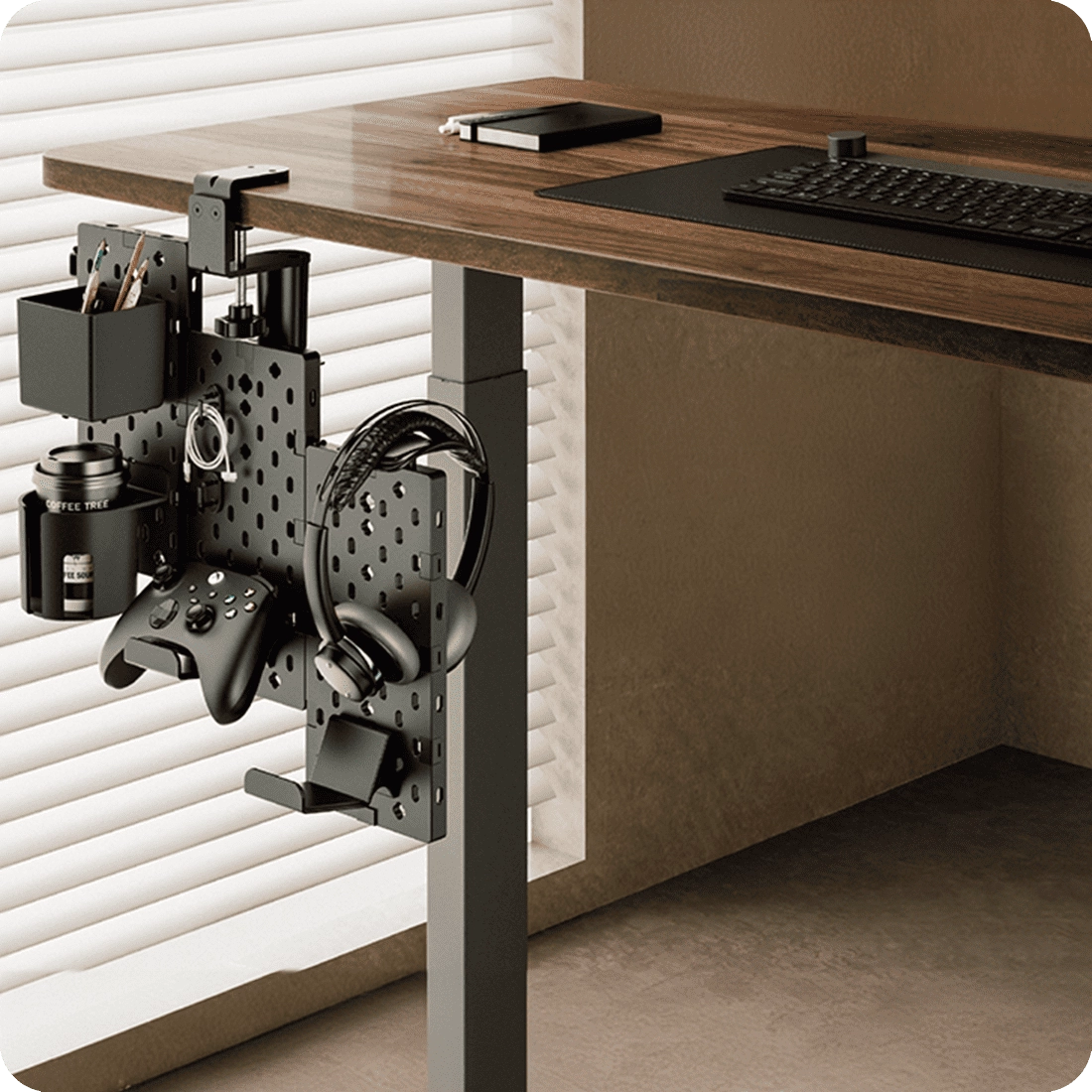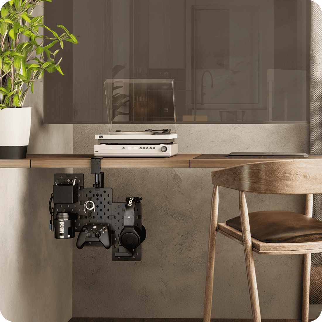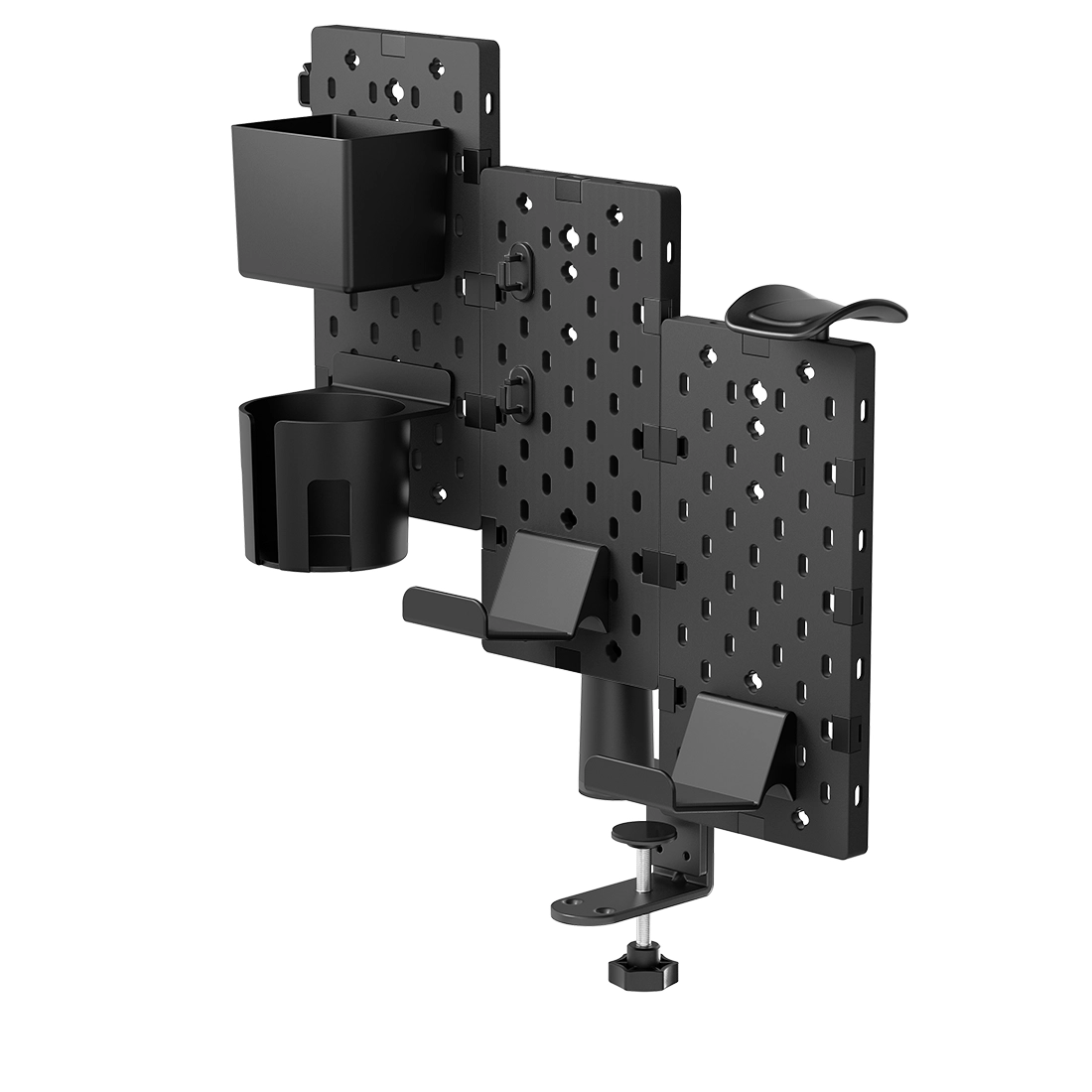 W zestawie oprócz 3 modułowych części perforowanych możesz znaleźć uchwyty na artykuły piśmiennicze, na kubek, na pady, uchwyt na słuchawki oraz uchwyty na kable. Jest to kompletny uchwyt biurkowy, dzięki któremu łatwo zorganizujesz akcesoria na biurku. To Ty decydujesz, w którym miejscu zamontujesz dany element i jak go wykorzystasz.