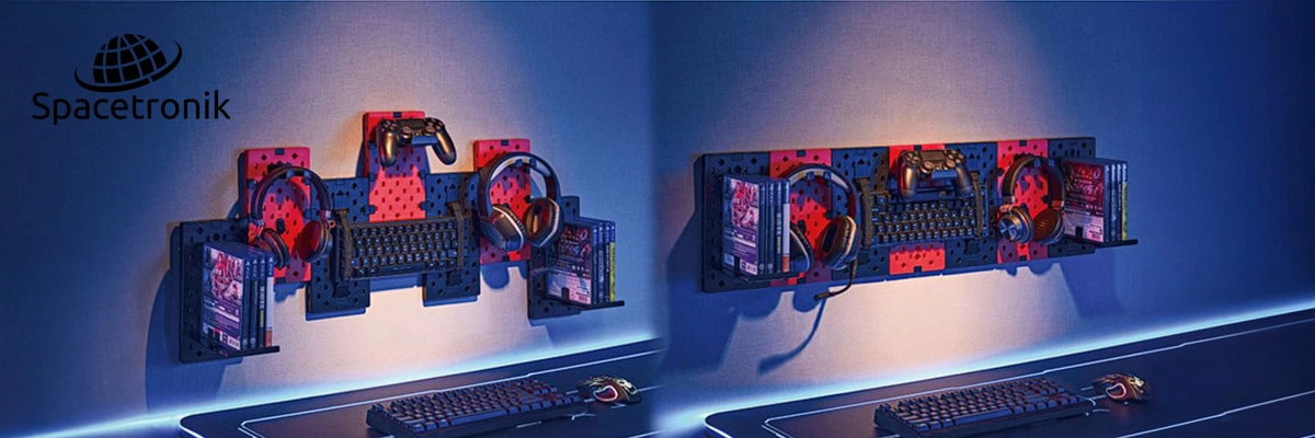 Co więcej, do zestawu dołączone zostały 2 uchwyty na kontroler typu pad, 2 wieszaki na słuchawki, 2 organizery kabli, 2 półki na płyty i do tego uchwyt na klawiaturę. Należy jednak pamiętać, że wszystkie dołączone elementy mają charakter uniwersalny i dasz radę w nich umieścić również inne przedmioty typu np. konsola przenośna. Dzięki temu dopasujesz swoją ściankę perforowaną SPB-157R do własnych potrzeb.