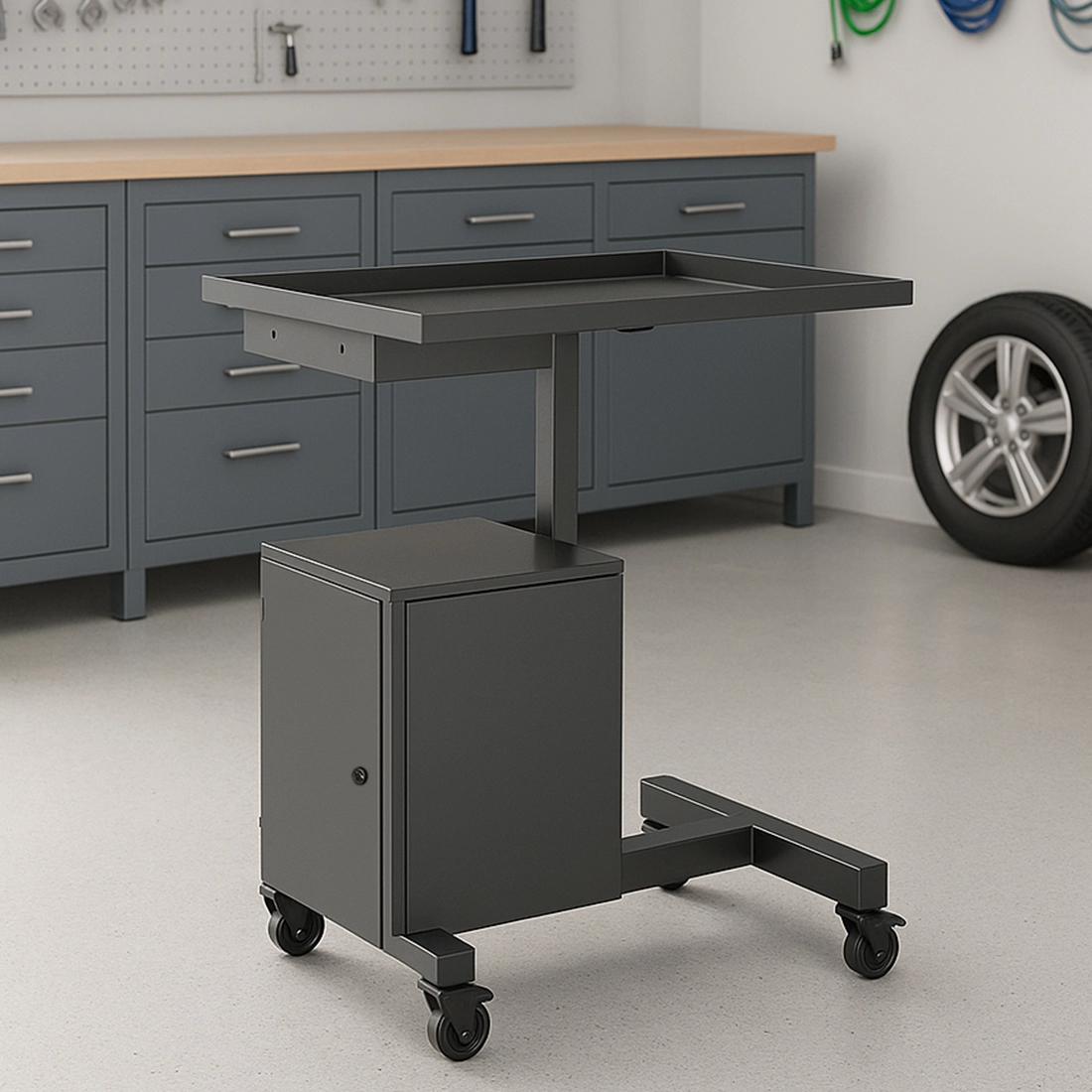Wózek SPC141B oferuje aż trzy przestrzenie robocze: blat, półkę pośrednią i zamykaną szafkę. To perfekcyjna organizacja narzędzi, części lub dokumentów – koniec z chaosem i stratą czasu. Każdy poziom ma swoje zadanie, co zwiększa efektywność i komfort użytkowania. Teraz wszystko, czego potrzebujesz, jest zawsze w zasięgu ręki.