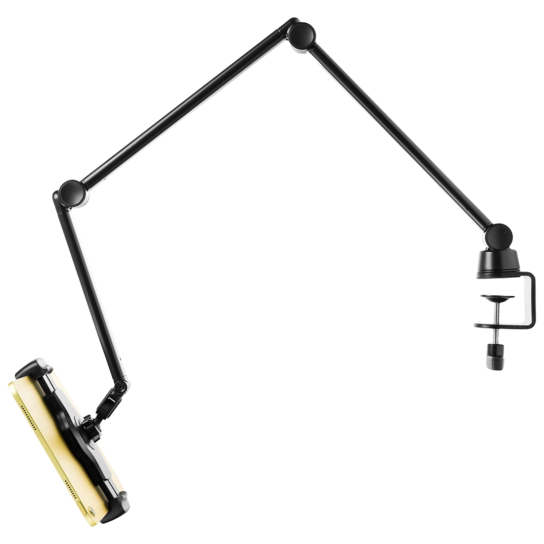 • Uchwyt do tableta i smartfona z klamrą na biurko. Kompatybilny z iPad i telefonami, obrotowy, aluminiowy, stabilny, do montażu bez narzędzi. Idealny do pracy zdalnej, oglądania filmów, wideorozmów i biura.