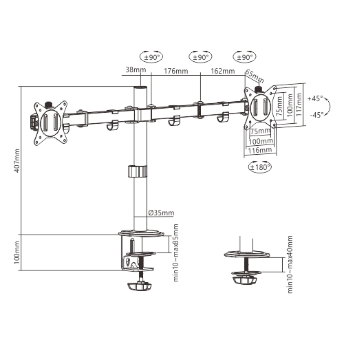 - Sugerowana grubość biurka: Zacisk: 10 ~ 85 mm Przelotka: 10 ~ 40 mm
