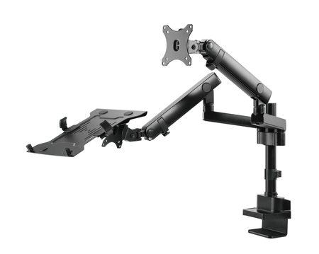 • Uchwyt na monitor i laptopa Spacetronik SPA-H121. Jest to idealne rozwiązanie dla wszystkich tych, którzy chcą zaoszczędzić miejsce na swoim blacie.Możliwości dostosowania pochyłu uchwytu, obrotu i obrotu ekranu.