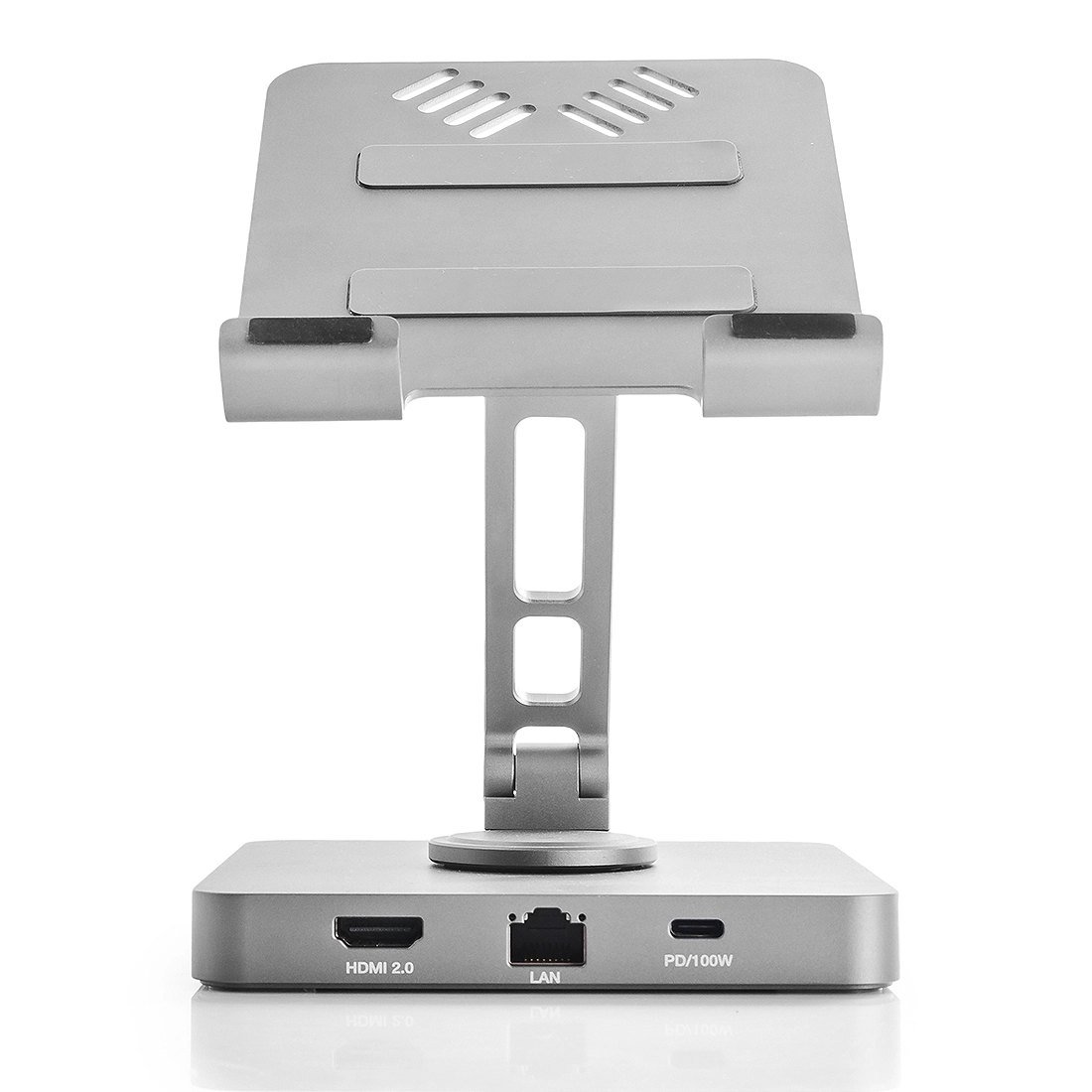 Podstawka pod laptop z USB-C, USB, HDMI, czytnikiem kart, Rj45 oraz AUX to praktyczne akcesorium, które pozwala na wygodniejsze i bardziej funkcjonalne korzystanie z tabletu. Jest to rodzaj stacji dokującej lub podstawki, którą można umieścić na biurku, stole lub gdziekolwiek zechcesz, aby rozszerzyć jego możliwości podłączania różnych urządzeń.