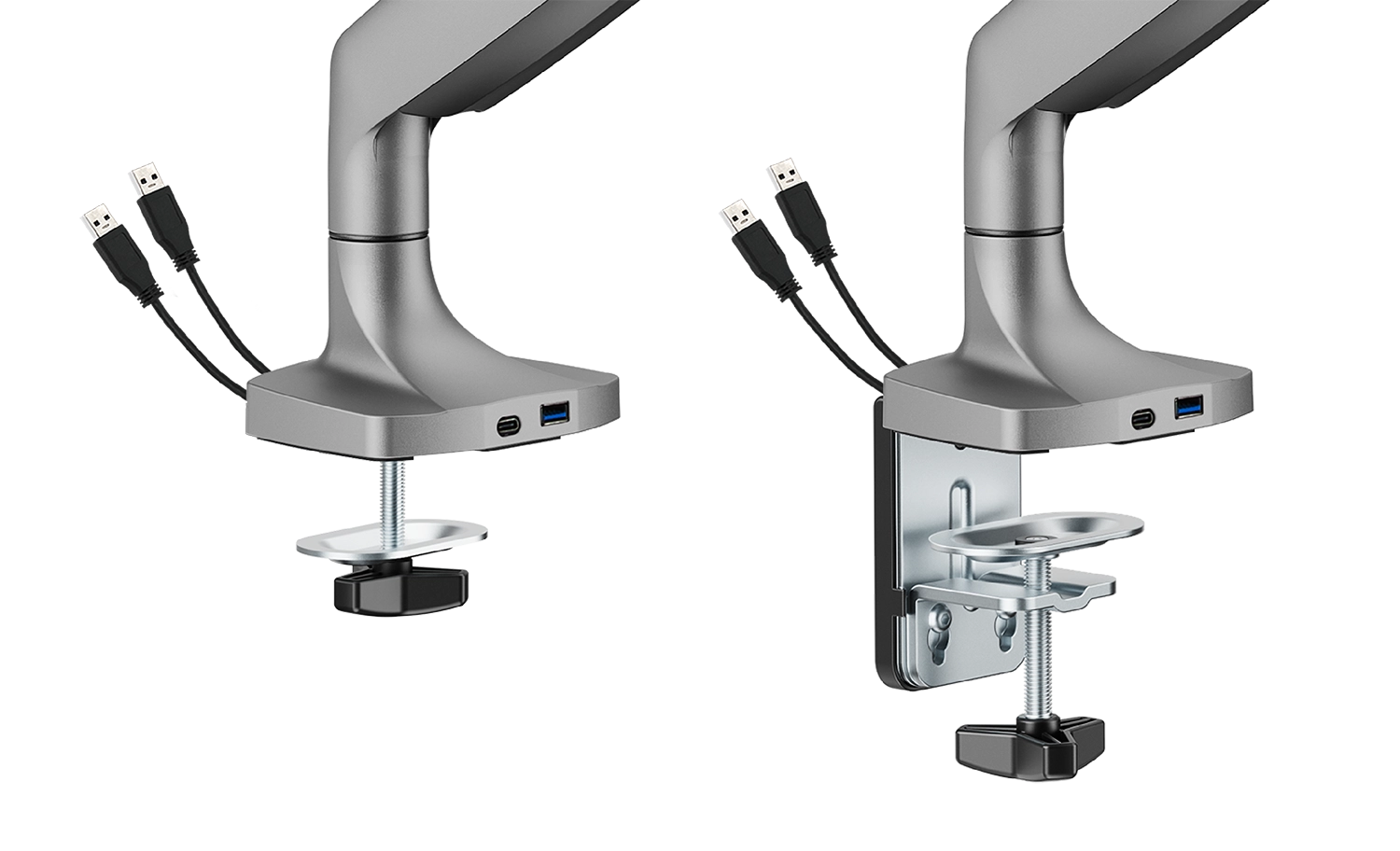 Podstawa uchwytu do monitora Spacetronik SPA-S110S została wyposażona w dwa wejścia USB (USB-A, USB-C). Oznacza to, że z łatwością podłączysz pod nie np. swój telefon. Dzięki temu będziesz mógł np. ładować swojego smartfona bez potrzeby wstawania od komputera. Z uchwytem SPA-S110S możesz mieć pod ręką wszystko to, co jest Ci potrzebne do pracy.