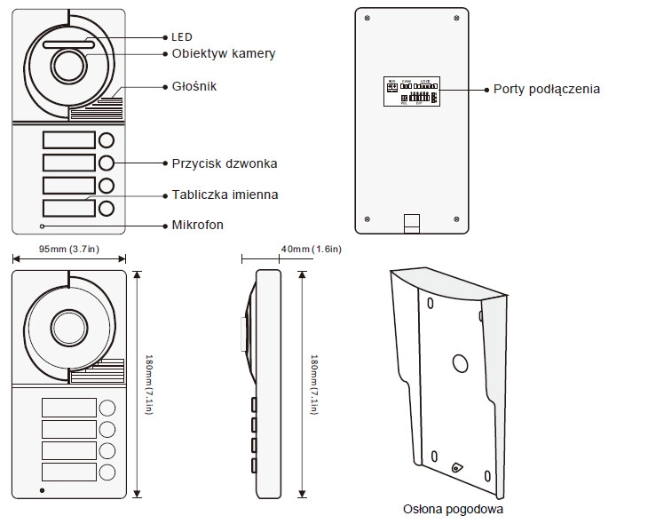 • Jednoabonentowa stacja bramowa z wbudowanym czytnikiem zbliżeniowym RFiD. Obiektyw 1,0 MP 3,6 mm, regulacja góra/dół, kąt widzenia obiektywu 120°.