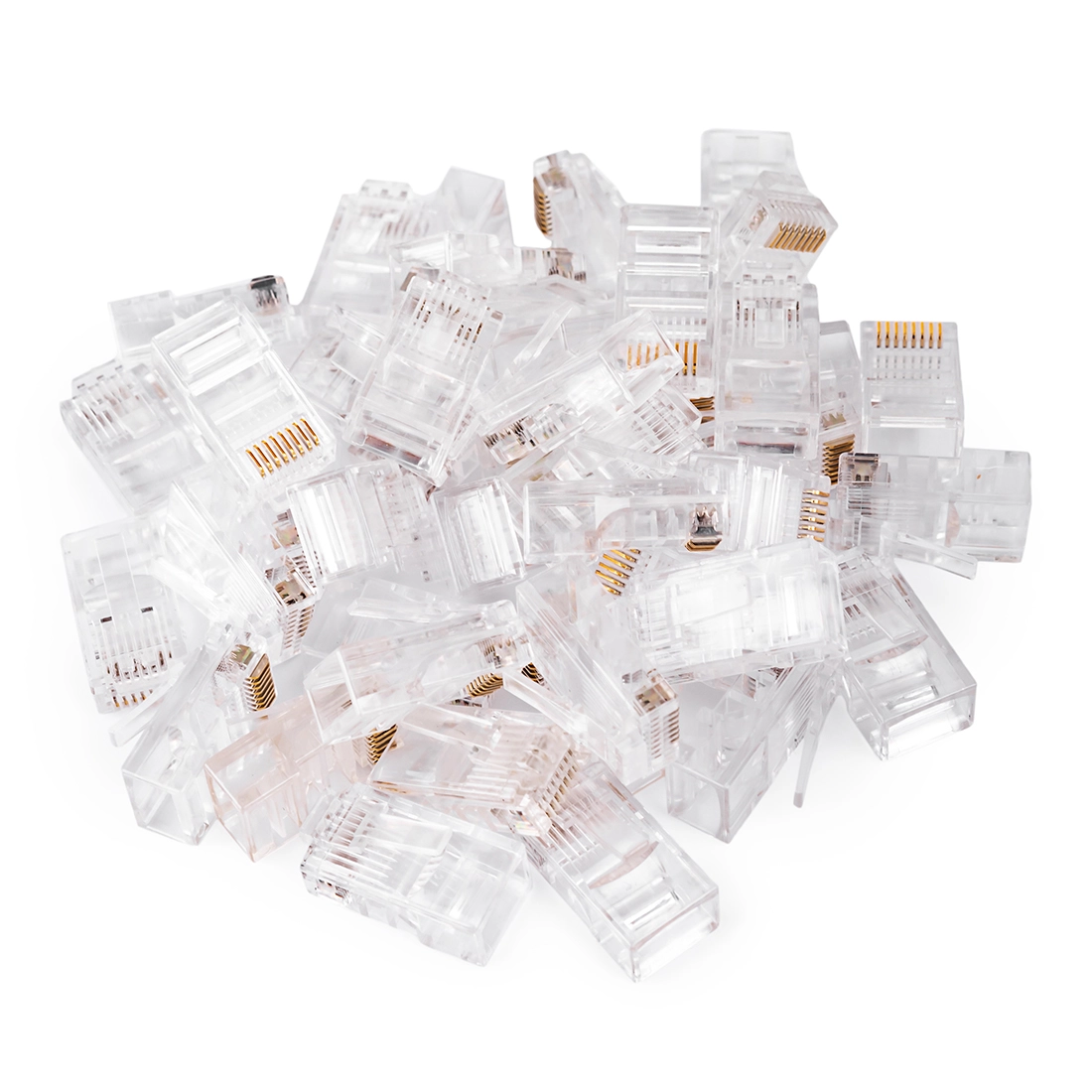 Zestaw 100 szt. standardowych ośmiostykowych wtyków RJ45 przystosowanych do zarabiania kabli teleinformatycznych LAN typu "skrętka". Końcówka jest uniwersalna - można ją stosować zarówno do kabli z żyłami z drutu, jak i linki.Piny wykonane z czystej miedzi ze stykami pokrytymi złotem, co zapewnia doskonałe przewodnictwo. Produkt wykonany w najnowszej technologii z wysokiej jakości materiałów. Zapewniają skuteczne połączenia kabli z gniazdami typu RJ45.