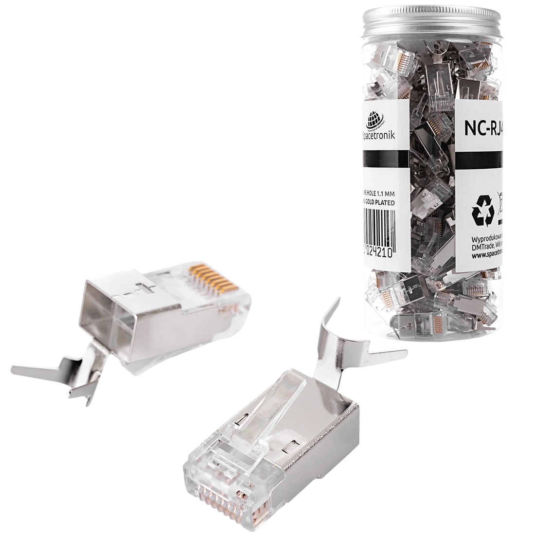 - Producent: Spacetronik - Rodzaj: Wtyk standardowy RJ45 (8P8C) - odpowiednie dla wszystkich rodzajów kabli (STP, FTP, UTP) - Kategoria 7 - Ekranowanie: FTP - Obudowa: metalowa - Kolor: przezroczysty - Zestaw 100 szt. - Dla żył 26-23 AWG - pozłacane całe piny z czystej miedzi (50u złota) - dla obu rodzajów kabli - do drutu i do linki - otwory w dwóch rzędach 4/4 (otwór 1.1 mm)