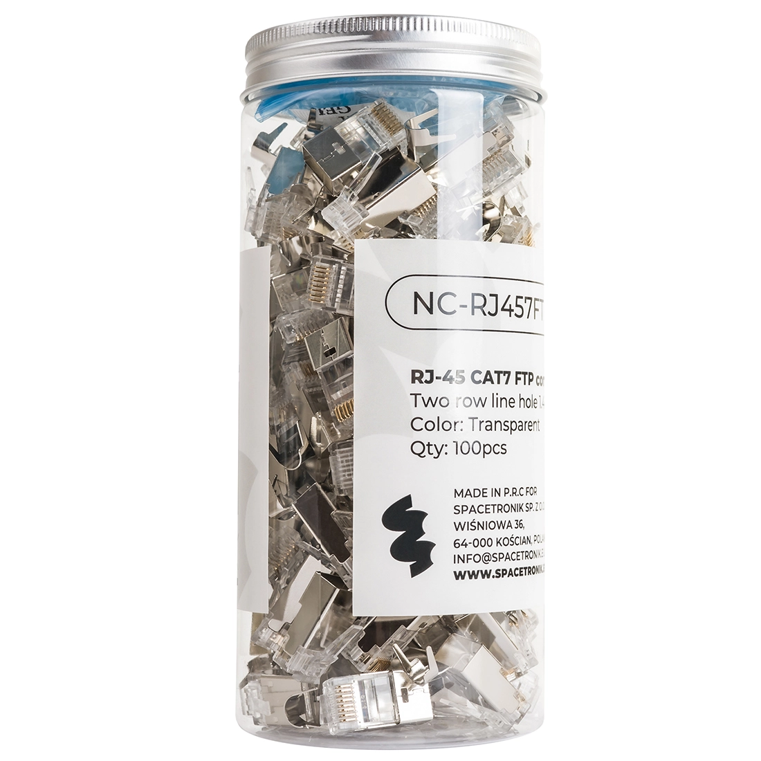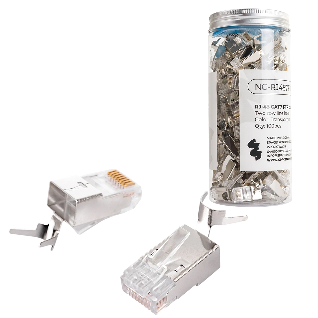 - Producent: Spacetronik - Rodzaj: Wtyk standardowy RJ45 (8P8C) - odpowiednie dla wszystkich rodzajów kabli (STP, FTP, UTP) - Kategoria 7 - Ekranowanie: FTP - Obudowa: metalowa - Kolor: przezroczysty - Zestaw 100 szt. - Dla żył 26-21 AWG - pozłacane całe piny z czystej miedzi (50u złota) - dla obu rodzajów kabli - do drutu i do linki - otwory w dwóch rzędach 4/4 (otwór 1.40 mm)