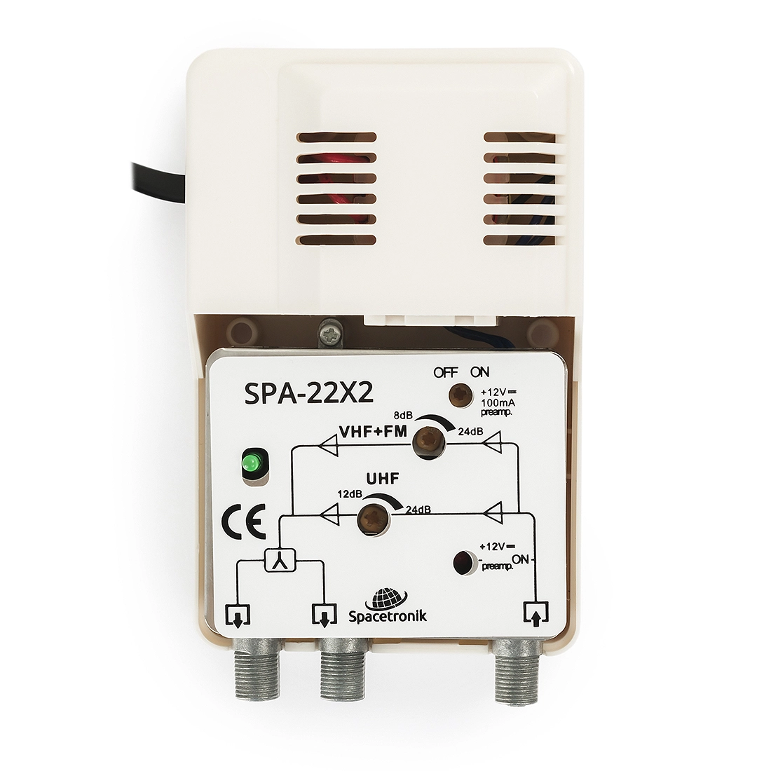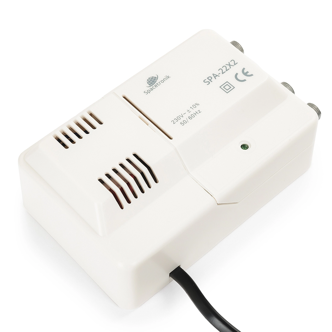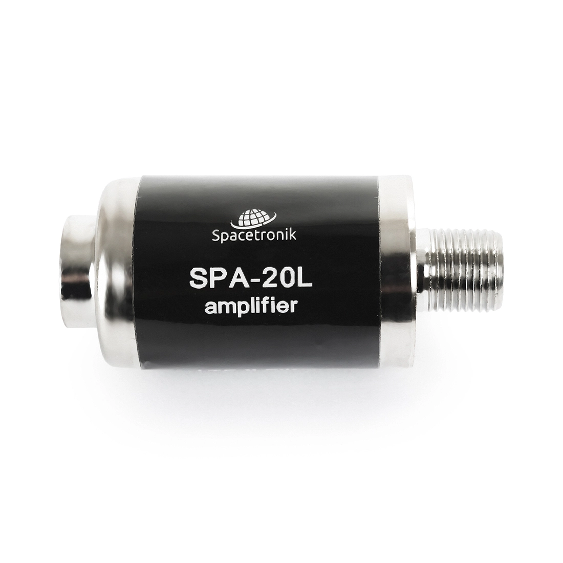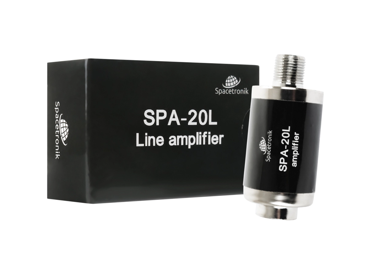 Liniowy wzmacniacz firmy Spacetronik zapewnia wzmocnienie 20dB w instalacjach antenowych telewizji naziemnej. Wzmacniacz można zamontować do gniazda F bezpośrednio przy antenie lub głowicy tunera. Wymaga on zasilania 5-12V. Można go zasilić zasilaczem antenowym lub bezpośrednio z poziomu tunera. Wzmocnienie dotyczy naziemnych sygnałów telewizji cyfrowej w paśmie 5-700MHz.