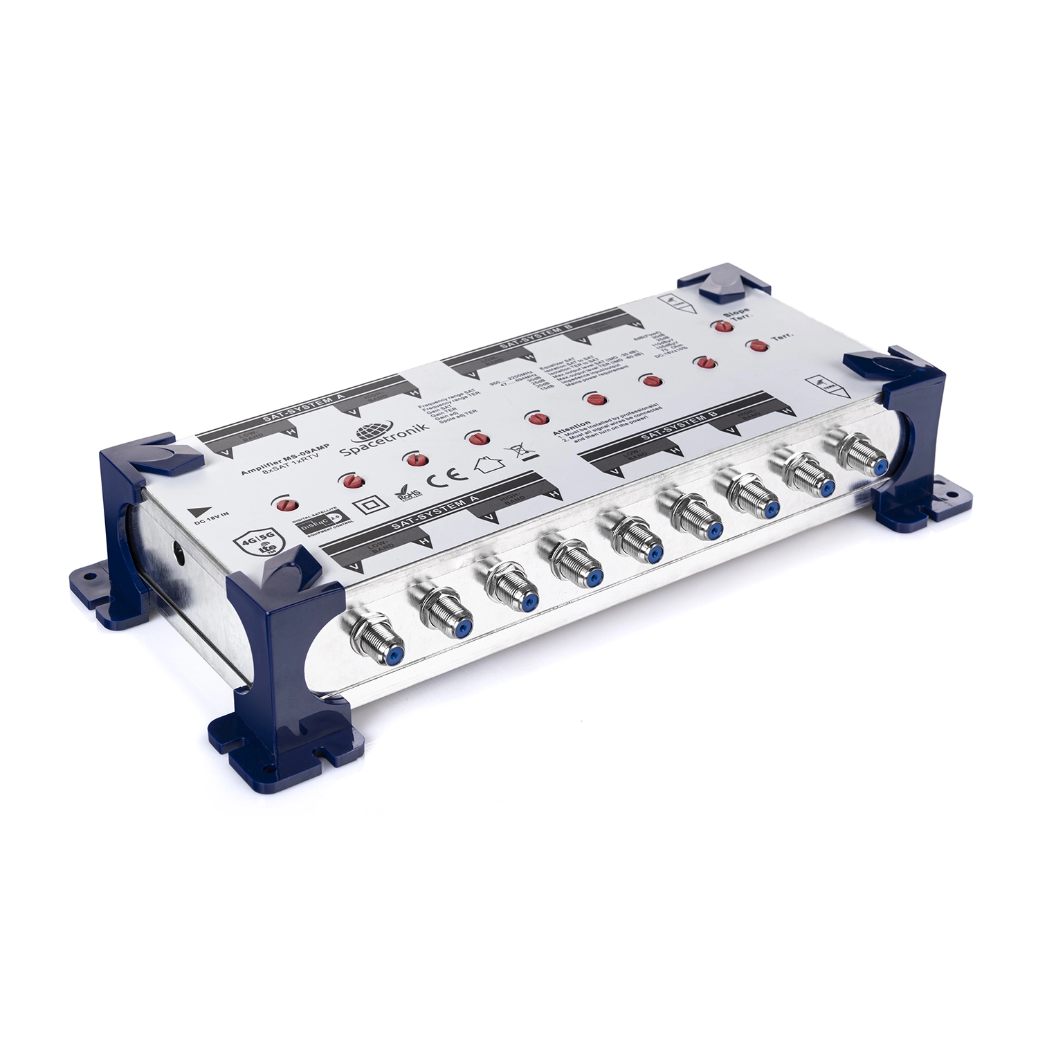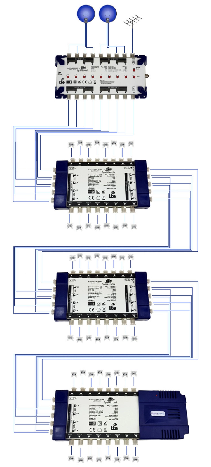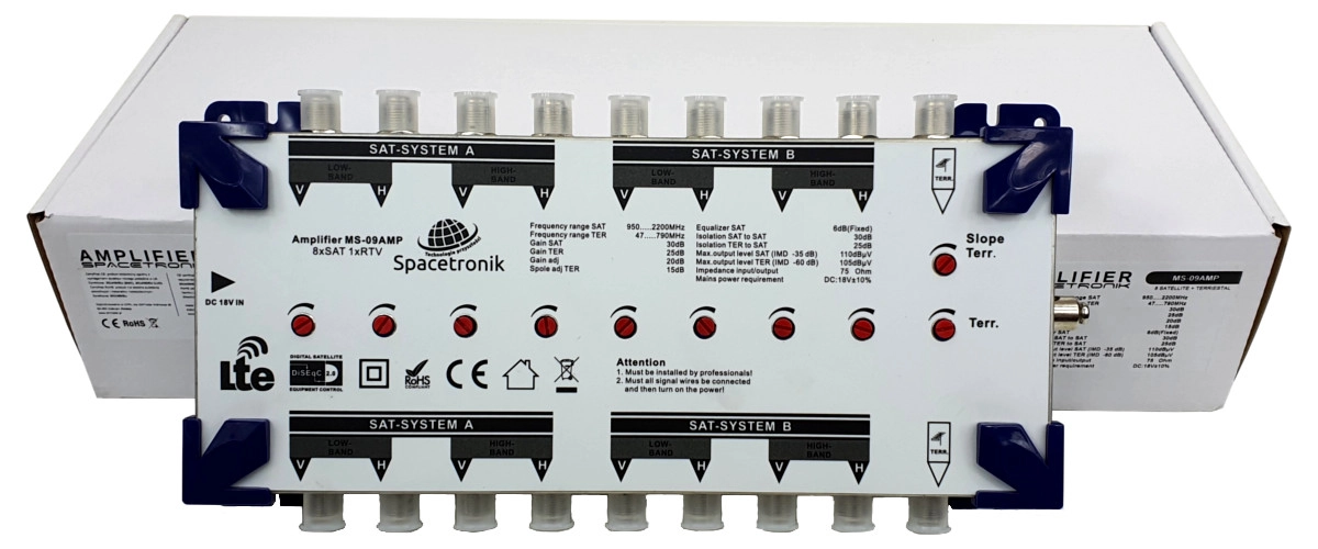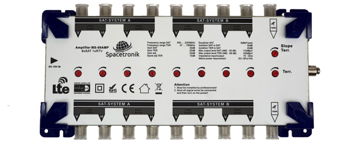 Wzmacniacz kaskadowy na dwie pozycję satelitarne zalecany do instalacji opartej o multiswitche kaskadowe wraz z telewizją naziemną dzięki któremu ustabilizujemy jakość dostarczanego sygnału w sytuacji, gdy należy kaskadować dużą ilość multiswitchy lub istnieją bardzo duże odległości pomiędzy multiswitchami lub multiswitchem a antenami. Zaletą wzmacniacza Spacetronik jest bardzo wysoki maksymalny poziom wyjściowy wzmacniacza w torze SAT jak i DVB-T. Tak dobre parametry, pozwalają montować wzmacniacz w niewielkich odległościach od anteny SAT.