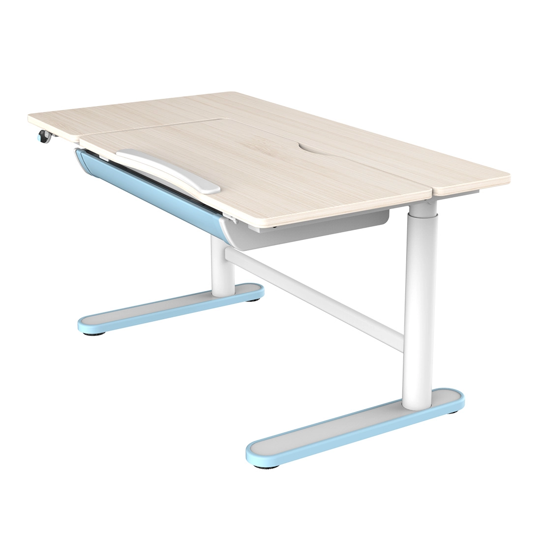 Blat biurka pozwala na wygodne ułożenie wszelkich akcesoriów oraz odpowiednie pochylenie podczas pisania, rysowania czy czytania. Możemy zauważyć, że nasze ciało inaczej układa się przy tych czynnościach - dziecko także zachowuje się w ten sposób. Blaty pochylają się nawet do 40 stopni, co ułatwia uzyskanie dogodnego kąta, podczas różnych aktywności. Dzięki tej funkcji znacząco ułatwiamy zachowanie prawidłowego ułożenia szyji i pleców podczas korzystania z biurka.