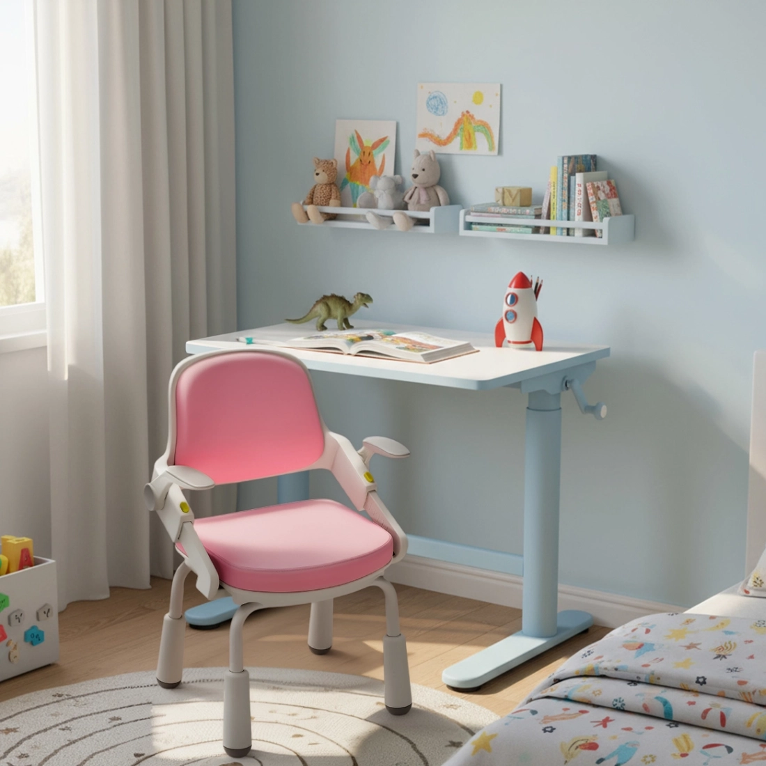 Po skończonej nauce krzesło można łatwo wsunąć pod biurko, co pozwala zachować porządek i przestrzeń w pokoju. Połączenie biało-różowego biurka i różowo-szarego krzesła tworzy harmonijne stanowisko, które sprzyja skupieniu i nadaje wnętrzu nowoczesnego charakteru.