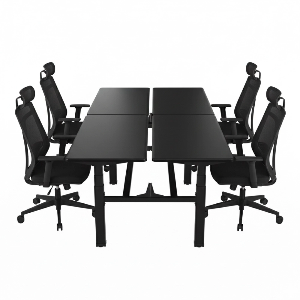 Zestaw do pracy zespołowej: 2× podwójny stelaż elektryczny Spacetronik SPE-440B + 4 blaty MDF Pure Black + 4 fotele GRINGO (czarne)