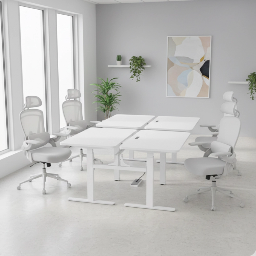 Stwórz nowoczesną „wyspę” do pracy dla czterech osób – bez kompromisów. Ten zestaw łączy 2 podwójne stelaże elektryczne Spacetronik SPE-440W (czyli 4 niezależne stanowiska), 4 blaty MDF malowane proszkowo w kolorze Porcelain oraz 4 ergonomiczne krzesła obrotowe Spacetronik DORIS 11 w kolorze szarym. To gotowe rozwiązanie do biura, open space, coworku i home office, gdzie liczy się ergonomia, estetyka i wygoda dla całego zespołu.