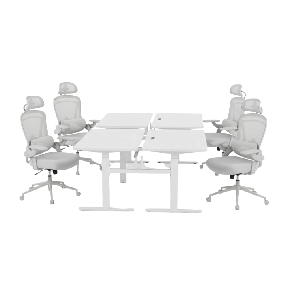 Zestaw do pracy zespołowej: 2× stelaż elektryczny Spacetronik SPE-440W + 4× blat MDF Porcelain + 4× krzesło DORIS 11 (szare)