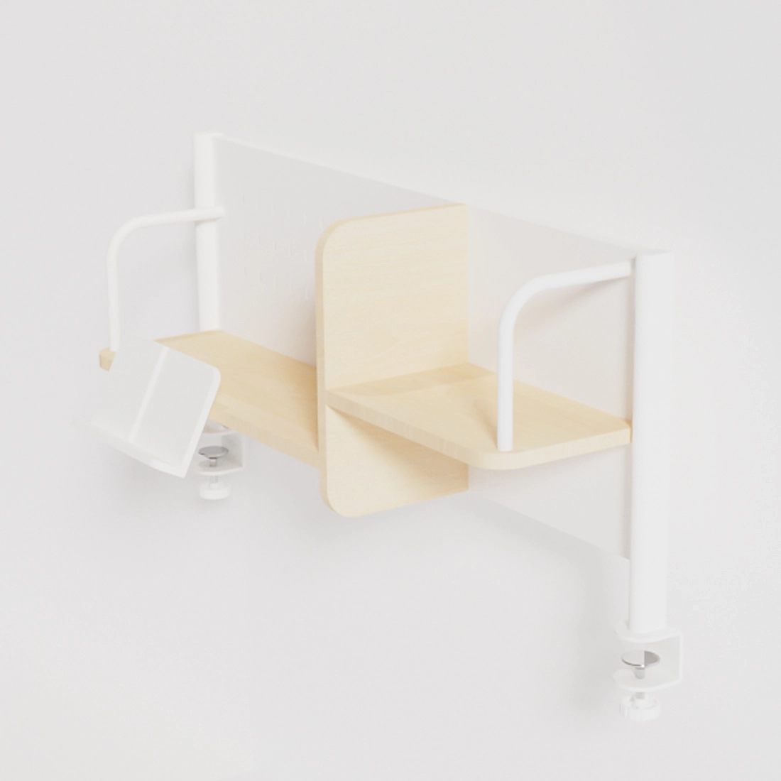 Perforowana ścianka daje możliwość personalizacji i dopięcia haczyków/akcesoriów – świetnie sprawdzi się na notatki, plan dnia czy inspiracje. Dwie półki tworzą dodatkową przestrzeń na książki, organizery lub elektronikę, a zintegrowana wysuwana podpórka ułatwia korzystanie z książki, dokumentów A4, telefonu czy tabletu.