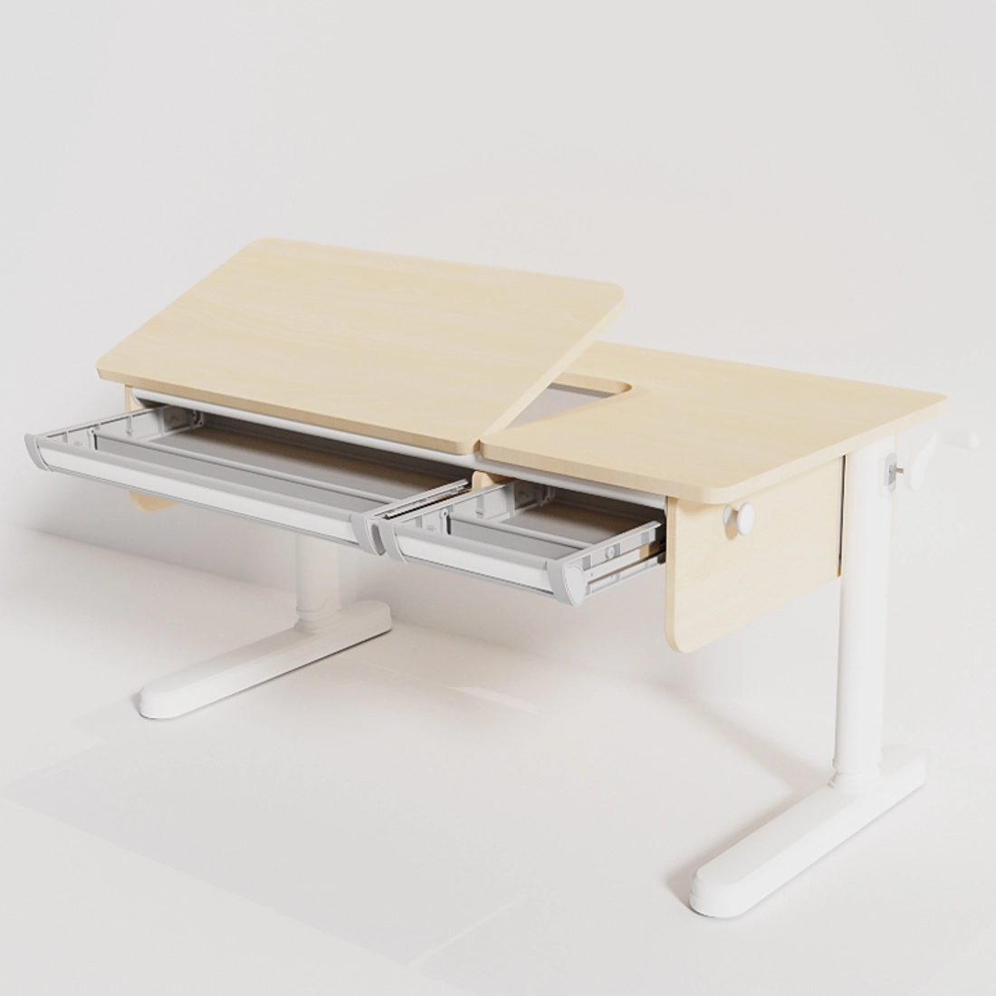 Blat podzielono na dwie niezależne części: jedną ruchomą (do pracy pod kątem) i drugą stabilną. To praktyczne rozwiązanie na co dzień – na płaskiej części możesz postawić lampkę, kubek, piórnik czy tablet, a część roboczą ustawić tak, jak w danym momencie jest najwygodniej.