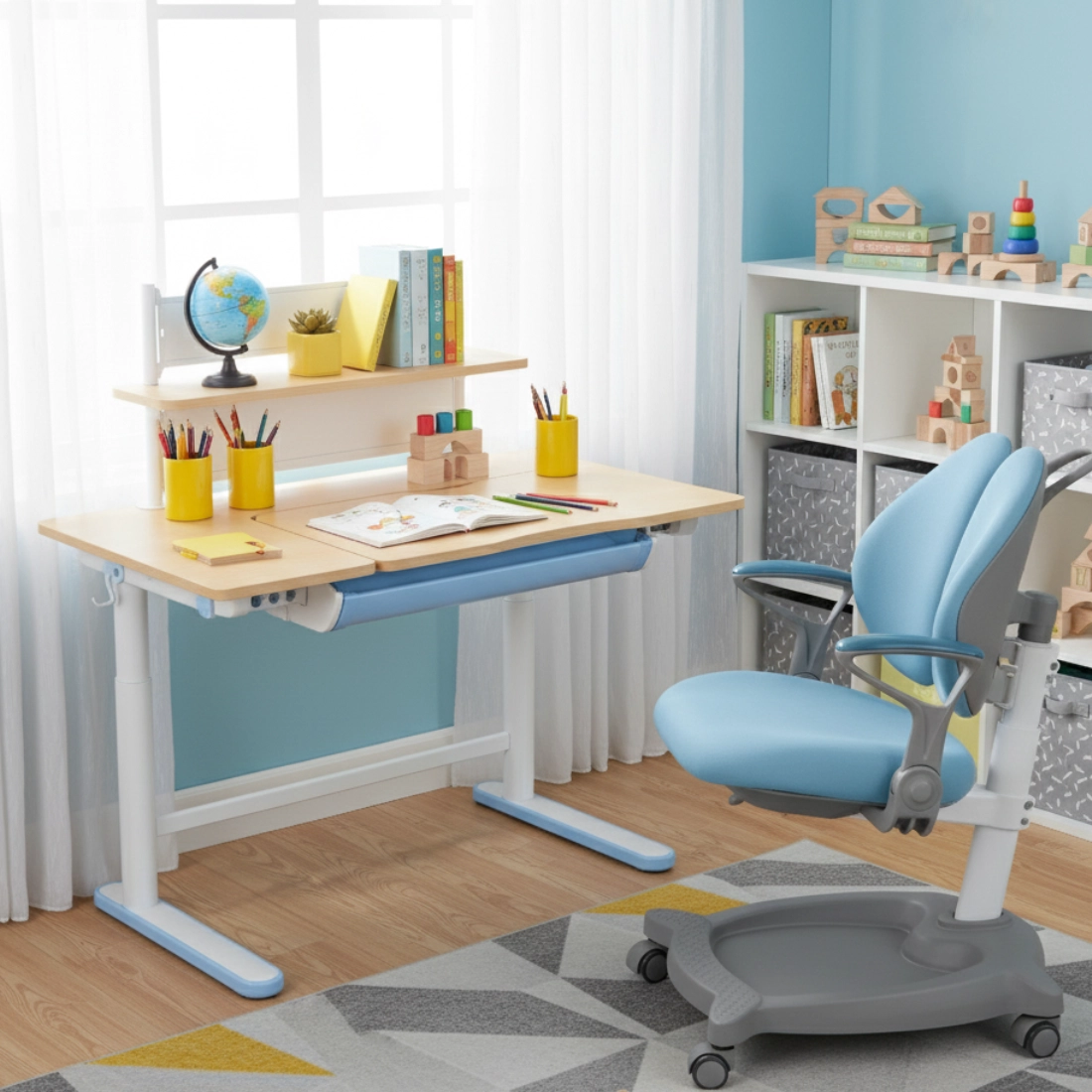 Kompletny zestaw do nauki i zabawy dla Twojego dziecka! W pakiecie otrzymujesz biurko z elektryczna regulacja wysokosci SPE-X116A (55–89 cm, blat 112 × 60 cm) z dodatkowa pólka i uchwytem na tablet/ksiazke oraz ergonomiczne krzeslo SPC-XD-05 z osobna regulacja wysokosci oparcia i siedziska, regulacja glebokosci siedziska 12 cm, regulowanymi podlokietnikami (90°) i kólkami grawitacyjnymi z blokada (wl/wyl). Komplet rosnie wraz z dzieckiem (ok. 110–180 cm), wspiera prawidlowa postawe, porzadek i koncentracje. Neutralne bialo-niebieskie biurko i krzeslo w tej samej kolorystyce pasuja do wiekszosci aranzacji pokoju dzieciecego.
