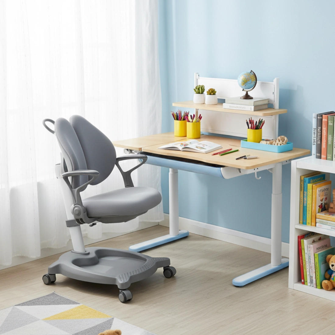 Kompletny zestaw do nauki i zabawy dla Twojego dziecka! W pakiecie otrzymujesz biurko z elektryczna regulacja wysokosci SPE-X116A (55–89 cm, blat 112 × 60 cm) z dodatkowa pólka i uchwytem na tablet/ksiazke oraz ergonomiczne krzeslo SPC-XD-05 z osobna regulacja wysokosci oparcia i siedziska, regulacja glebokosci siedziska 12 cm, regulowanymi podlokietnikami (90°) i kólkami grawitacyjnymi z blokada (wl/wyl). Komplet rosnie wraz z dzieckiem (ok. 110–180 cm), wspiera prawidlowa postawe, porzadek i koncentracje. Neutralne bialo-niebieskie biurko i krzeslo w tej samej kolorystyce pasuja do wiekszosci aranzacji pokoju dzieciecego.