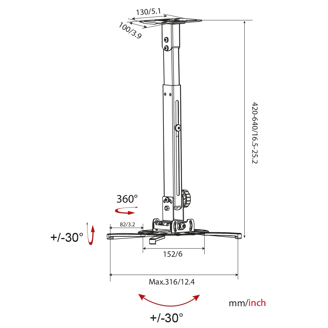 Uniwersalny uchwyt sufitowy do projektora SPA-P02B z regulacją wysokości 420–640 mm, obrotem 360° i pochyłem +30°/–30°.