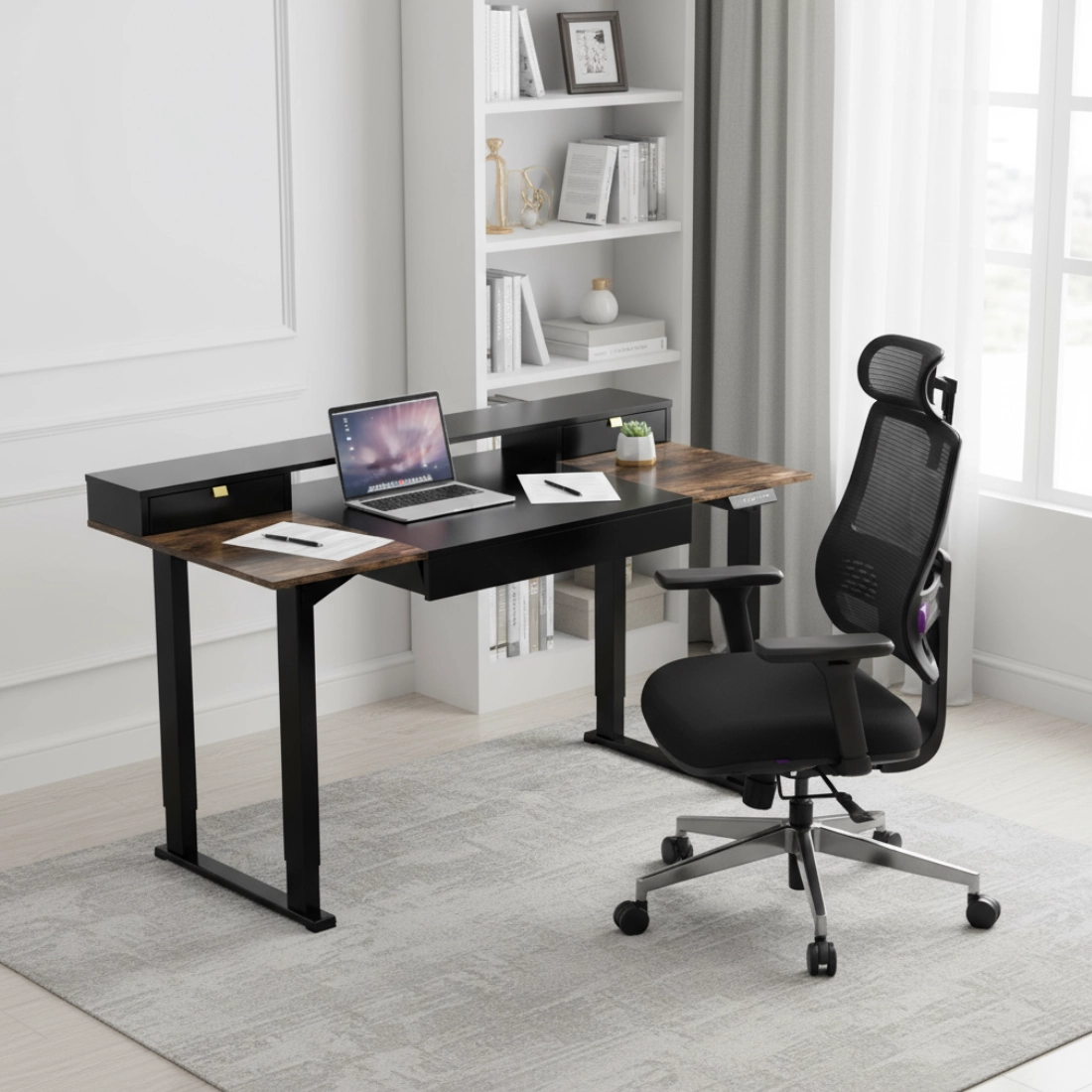Duże stanowisko do pracy i nauki: biurko z elektryczną regulacją 730–1200 mm, udźwigiem 90 kg, półką 160 cm i trzema szufladami oraz krzesło z automatycznym wsparciem lędźwi, zagłówkiem 5D i podłokietnikami 4D. Stabilność, porządek i pełne dopasowanie każdego dnia.