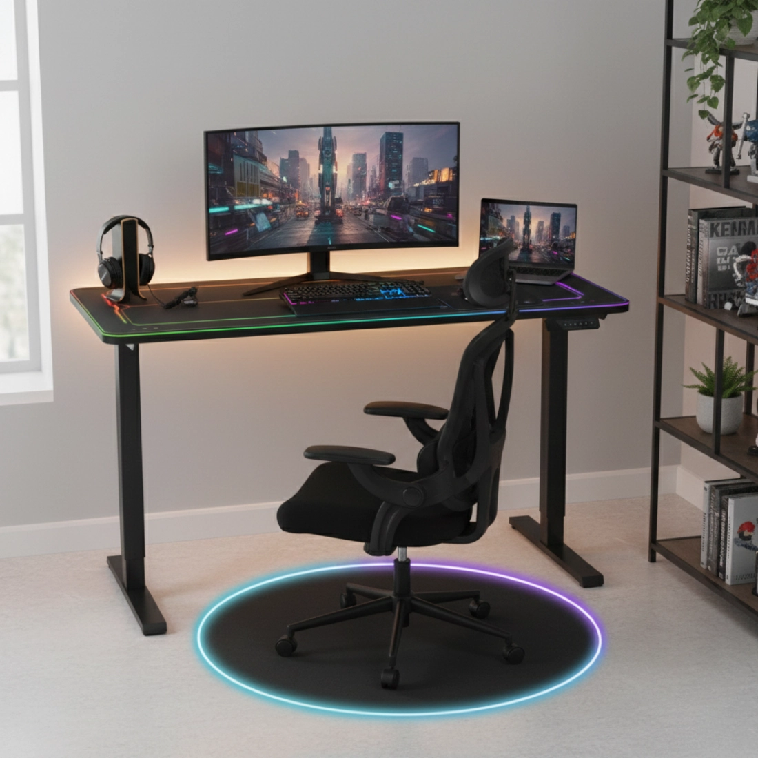 Zestaw sprawdzi się w pokoju gracza, domowym biurze i przy stanowisku do streamingu. Biurko zapewnia szybkie dopasowanie wysokości i efektowny wygląd dzięki RGB, krzesło DORIS 11 wspiera plecy i pozwala ustawić wygodną pozycję na długie godziny, a mata SPB047_RGB chroni podłogę oraz dodaje efektowną poświatę RGB pod stanowiskiem. To komfort, który czuć od pierwszego dnia — i funkcje, które realnie ułatwiają codzienne korzystanie ze stanowiska.