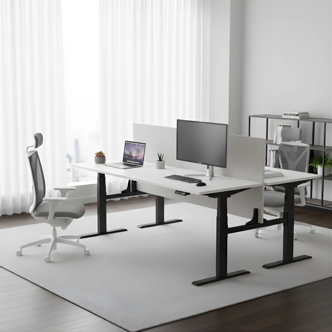 Ten zestaw świetnie pasuje do biur typu open space, gdzie stanowiska tworzą wyspy. Jedna konstrukcja daje dwa biurka regulowane, a opcjonalna możliwość zastosowania panelu dzielącego pomaga zadbać o komfort i prywatność pracy. Czerń stelaża i blatów buduje nowoczesny, profesjonalny wygląd całej przestrzeni.