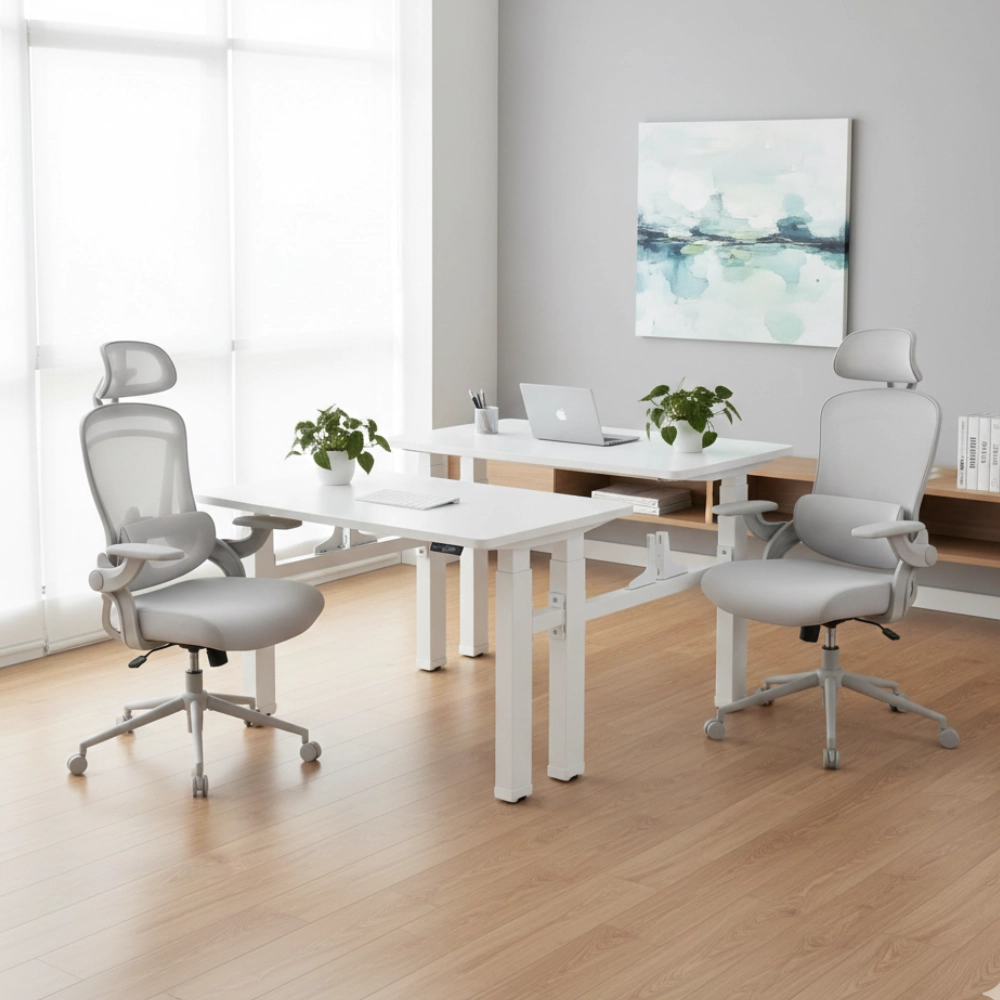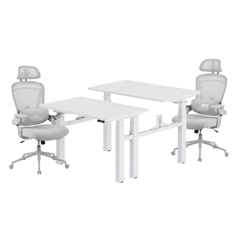Jeśli tworzysz biuro, w którym liczy się ergonomia i elastyczność, ten komplet jest gotowym rozwiązaniem: dwie osoby pracują niezależnie (regulacja wysokości po obu stronach), a całość wygląda spójnie i profesjonalnie. Regularna zmiana pozycji (siedzenie/stanie) pomaga ograniczyć skutki długotrwałego siedzenia i wspiera lepszą koncentrację.