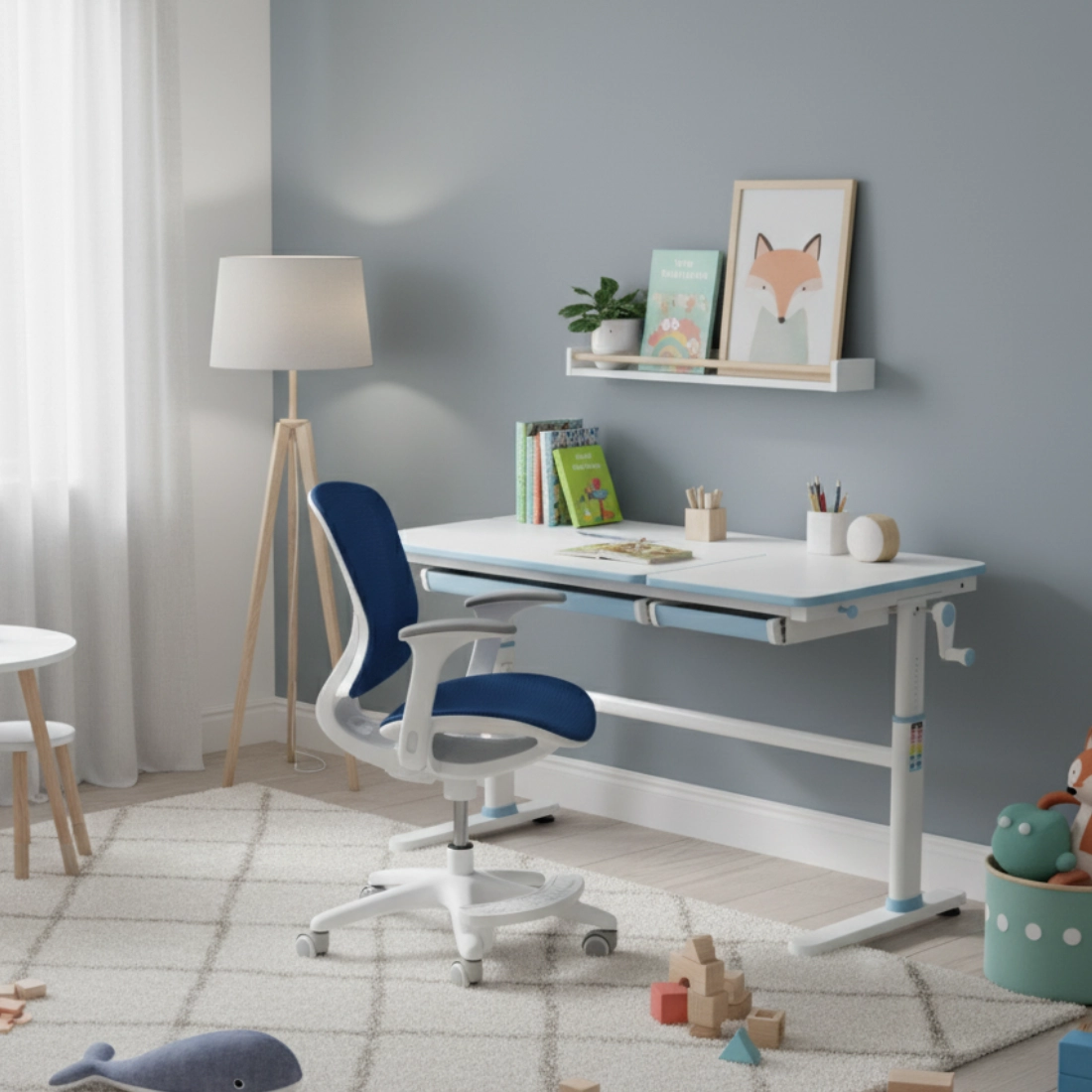 Kompletny zestaw do nauki i zabawy dla Twojego dziecka! W pakiecie otrzymujesz biurko z regulacją wysokości SPE-X104 oraz ergonomiczne krzesło SPC-XD-03S. Komplet rośnie wraz z dzieckiem (ok. 5–14 lat), wspiera prawidłową postawę, porządek i koncentrację. Neutralne biało-niebieskie biurko i turkusowe krzesło pasują do większości aranżacji pokoju dziecięcego.