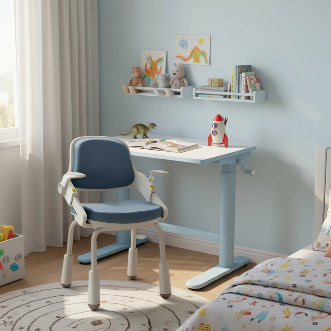 Uniwersalny design – Biało-niebieskie biurko + niebieskie krzesło ze szarą podstawą tworzą świeży, przyjazny zestaw do nauki.