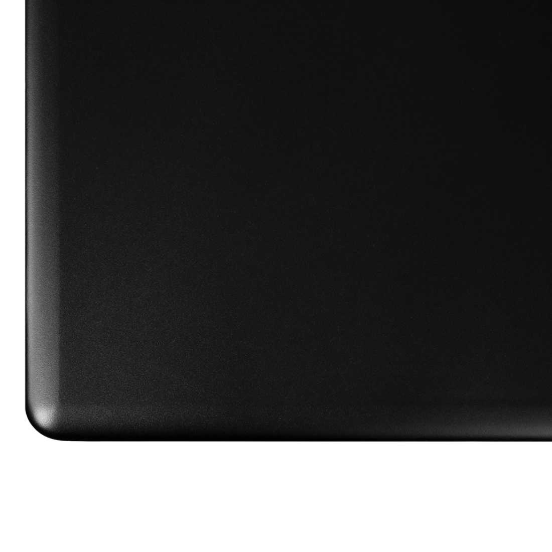 Blat MDF malowany proszkowo w kolorze Pure Black wyróżnia się głębokim kolorem, wysoką odpornością mechaniczną oraz właściwościami antybakteryjnymi. Zaokrąglone krawędzie typu full bullnose zwiększają bezpieczeństwo i estetykę, a grubość 25 mm zapewnia sztywność nawet przy intensywnym użytkowaniu.