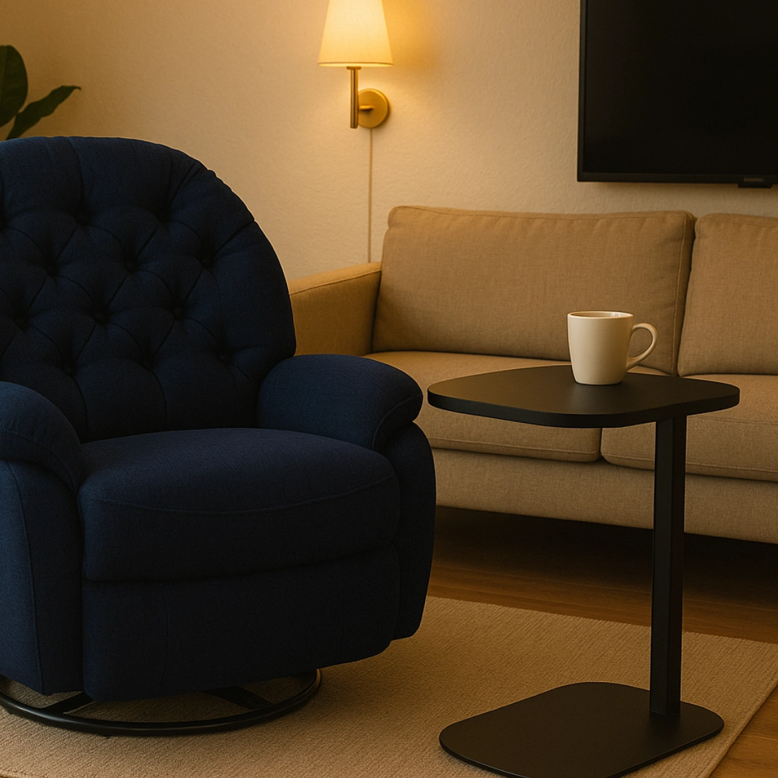 Domowa strefa relaksu i pracy w jednym: fotel FLAX 04 z elektrycznym rozkładaniem (2 przyciski: ROZŁÓŻ/ZŁÓŻ), funkcją kołyski (Glider) i ładowarką USB-C oraz kompaktowy stolik BUDDY 17 z gazową regulacją wysokości 645–1045 mm i blatem 600×350 mm. Miękko, cicho i ergonomicznie — od seansu filmowego po pracę z łóżka czy kanapy.