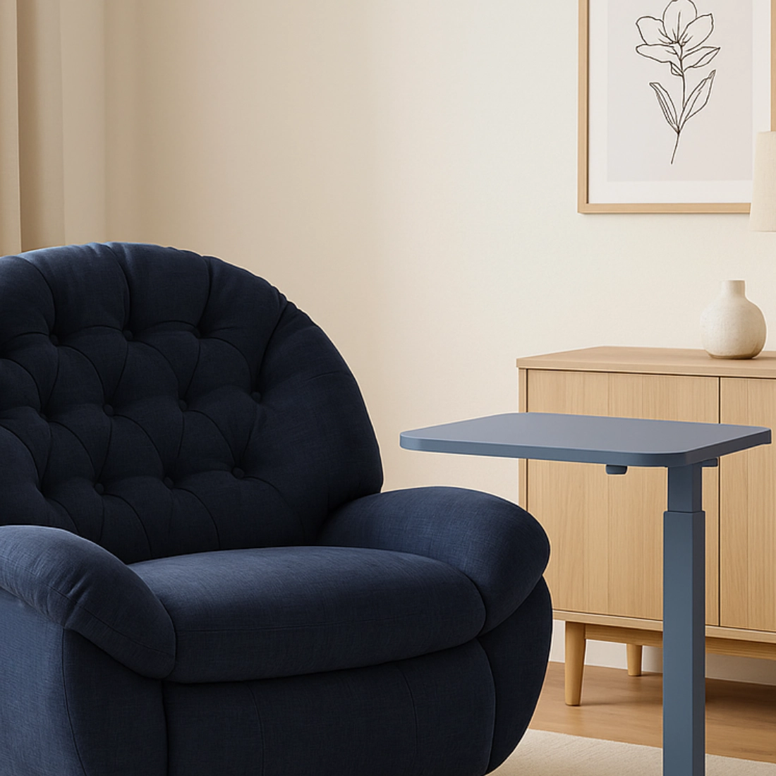 Komplet do relaksu i pracy: fotel FLAX 04 z elektrycznym rozkładaniem (ROZŁÓŻ/ZŁÓŻ), kołyską (Glider) i gniazdem USB-C oraz mobilny stolik BUDDY 15-GNN z dwoma blatami i gazową regulacją wysokości. Wygoda, ergonomia i akcesoria zawsze pod ręką — od maratonu filmowego po zdalną pracę z kanapy.