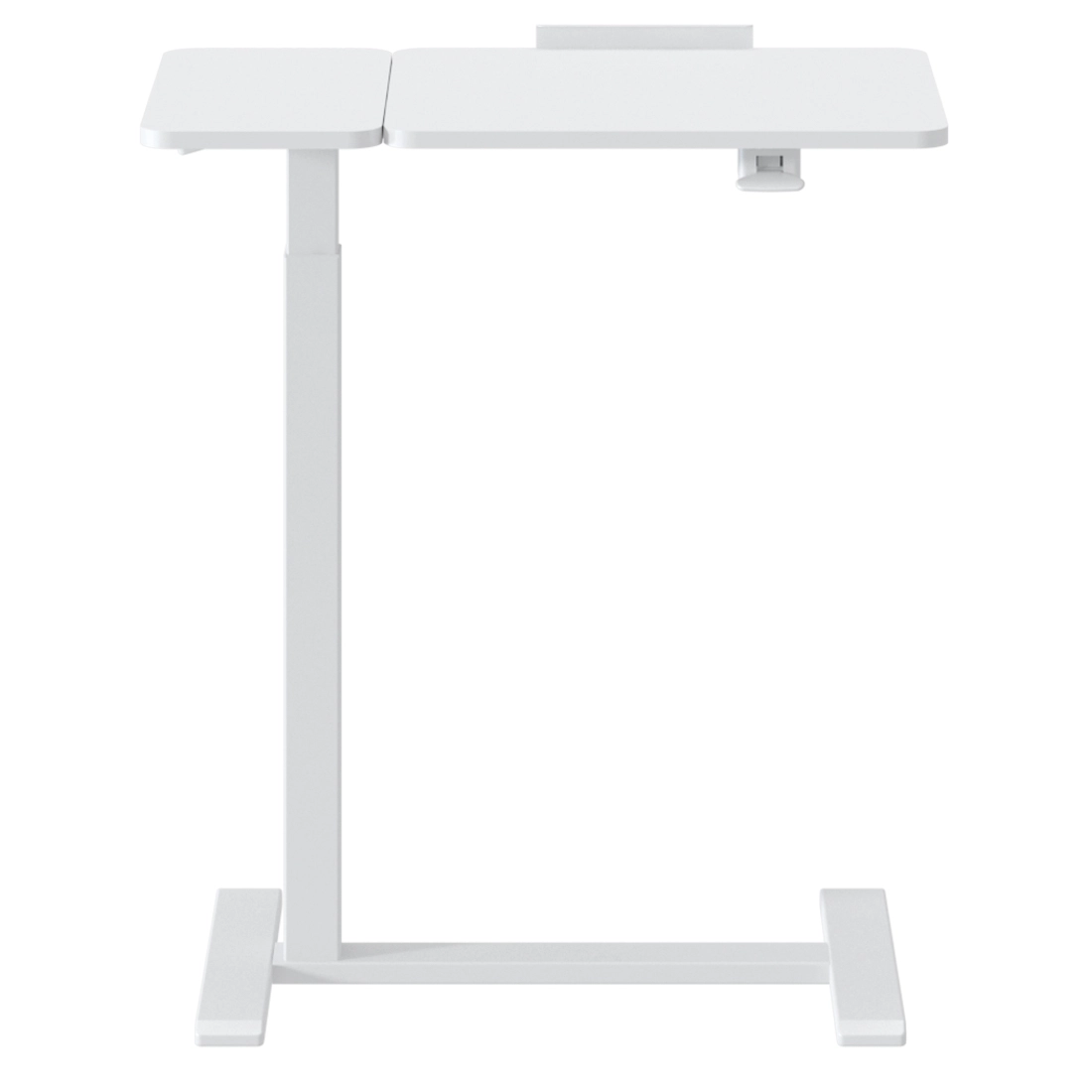 Wysokość 755–1108 mm dopasujesz w sekundę. Większy blat z regulacją kąta i listwą antypoślizgową stabilnie trzyma laptop/książkę, a mniejszy blat mieści myszkę, kubek i telefon. Podstawa typu H wygodnie wsunie się pod meble.